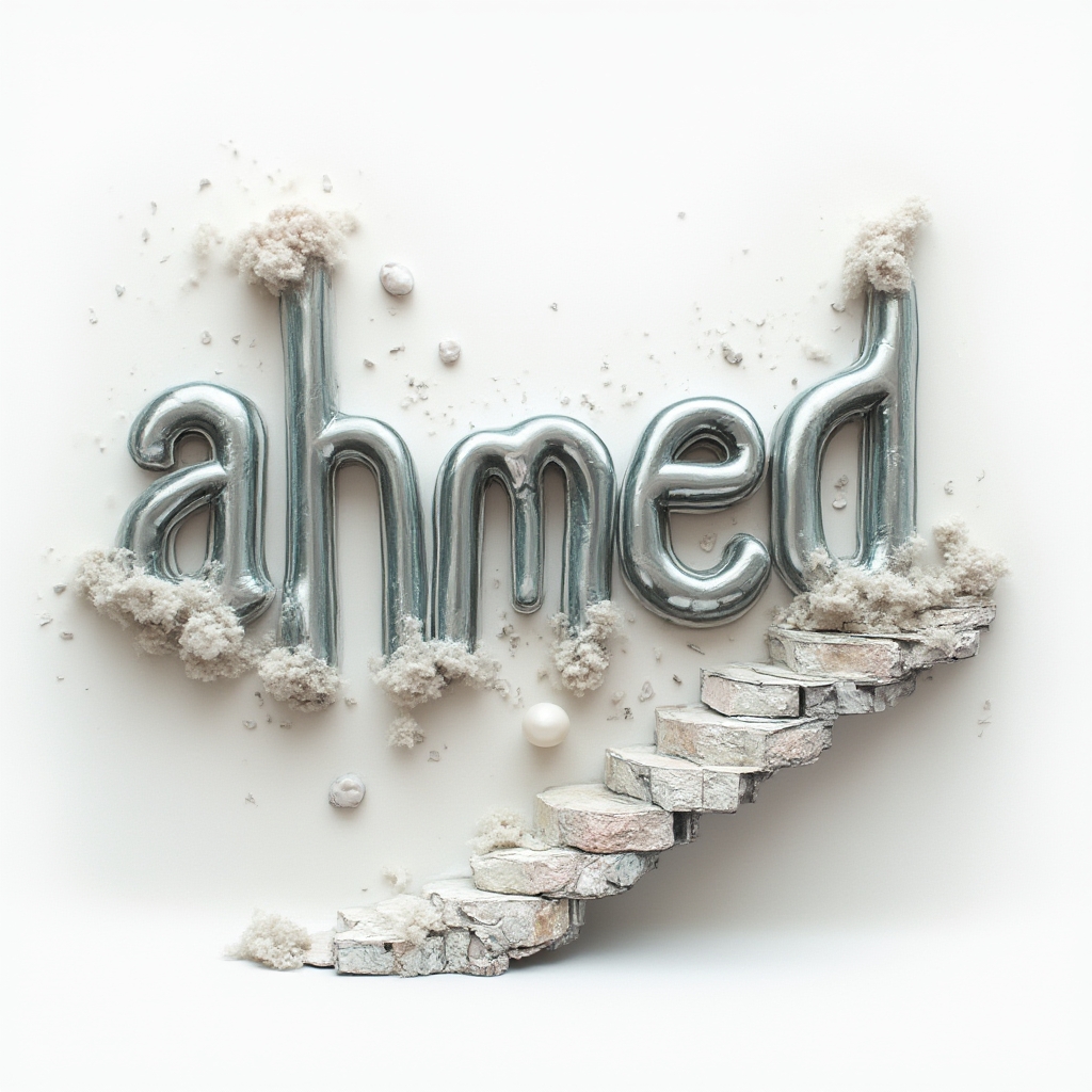 A surreal architectural dreamscape where the letters of "ahmed" morph into impossible floating structures.