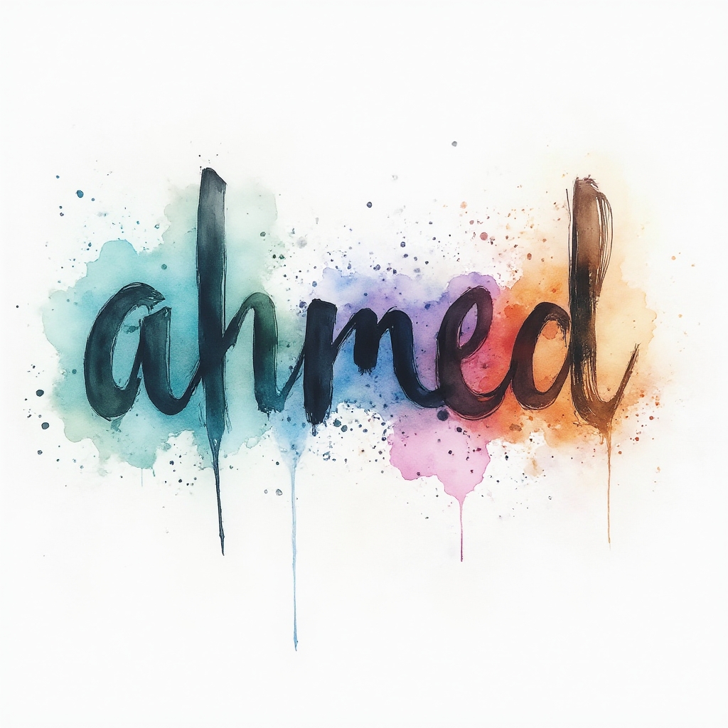 A fluid watercolor interpretation of "ahmed" where the letters dissolve into vivid splashes and drips.