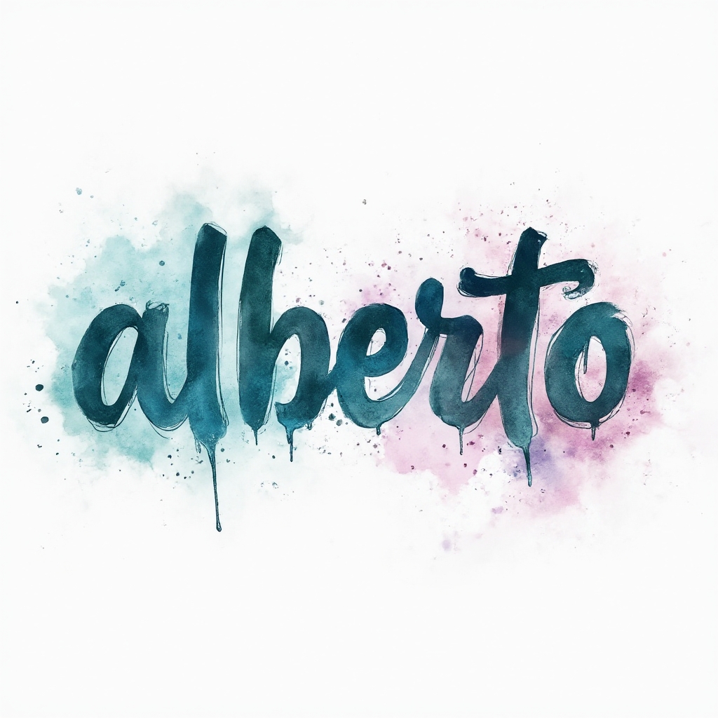 A colorful watercolor-inspired tattoo concept where Alberto is painted as fluid, splashy lettering with soft gradients and ink blooms on a white background.