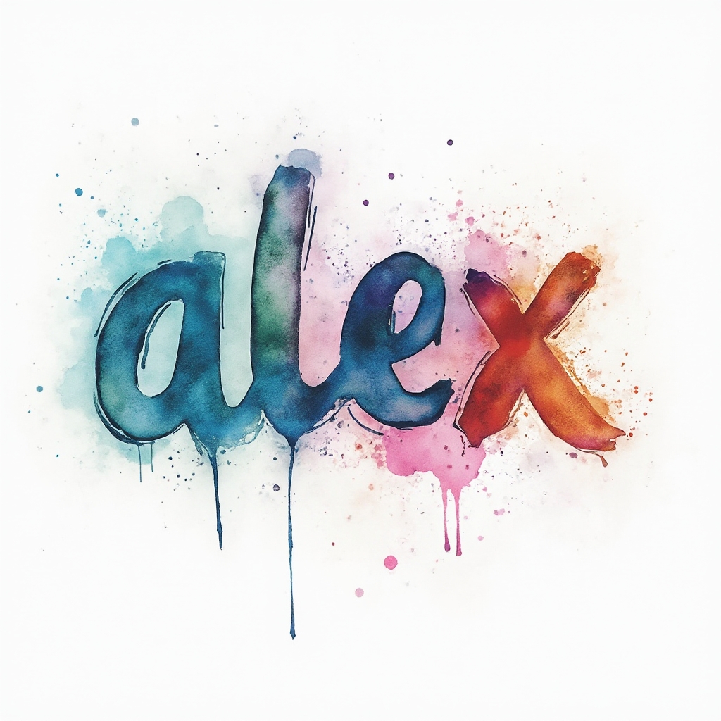 Soft, painterly watercolor lettering where vivid splashes and gradients flow through and around the name 'alex' on a white backdrop.