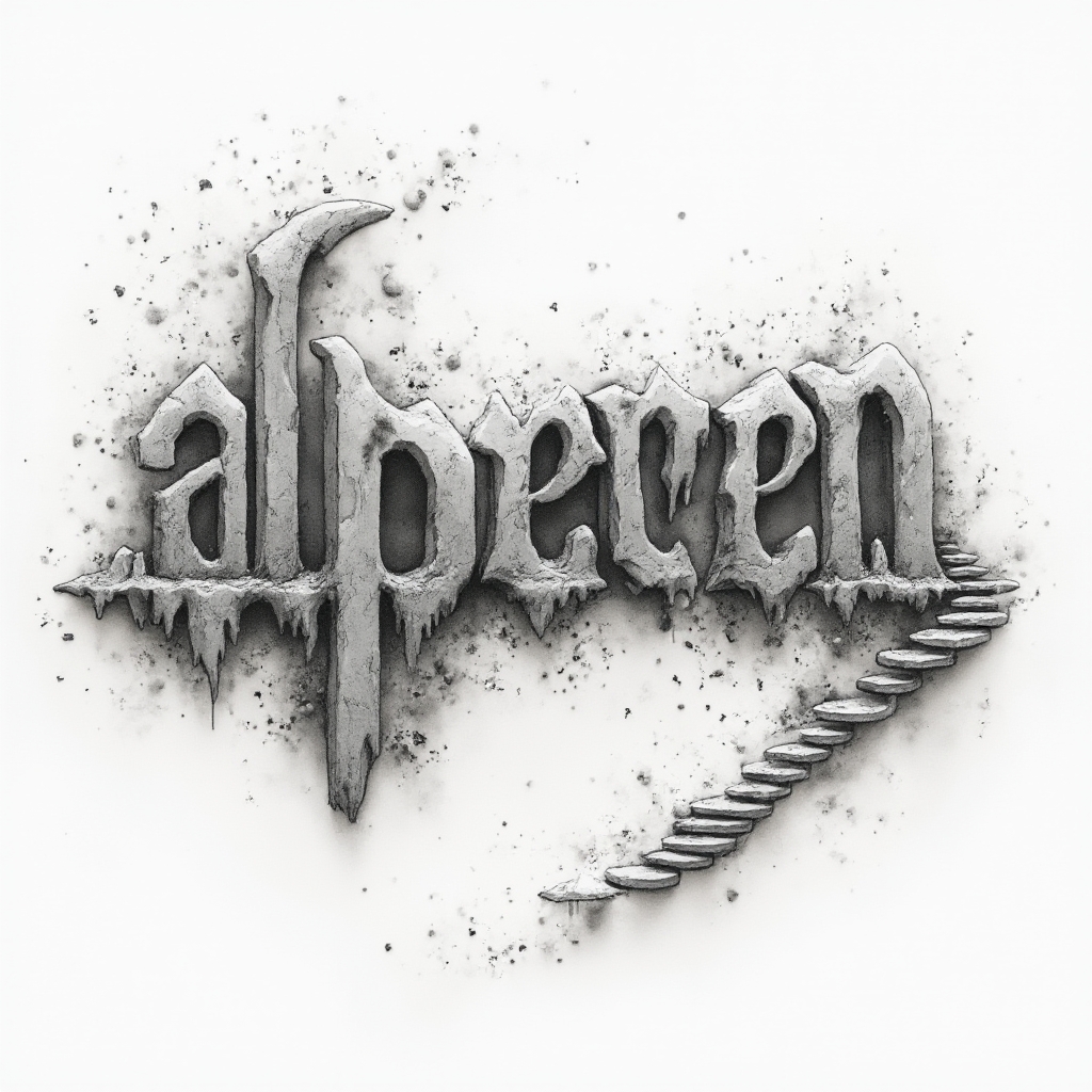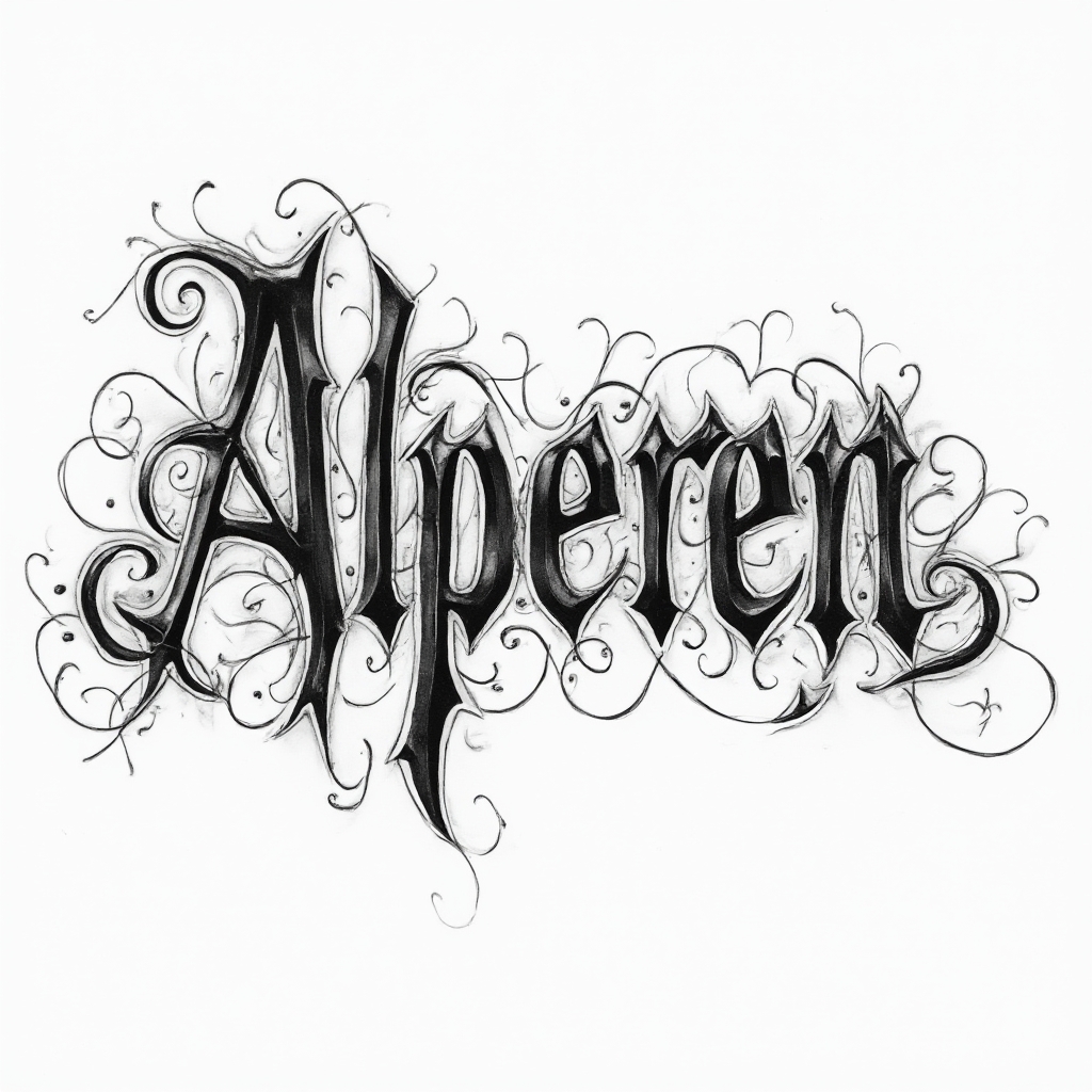 A surreal, dreamlike name tattoo where 'alperen' emerges from morphing abstract shapes and impossible forms on white.