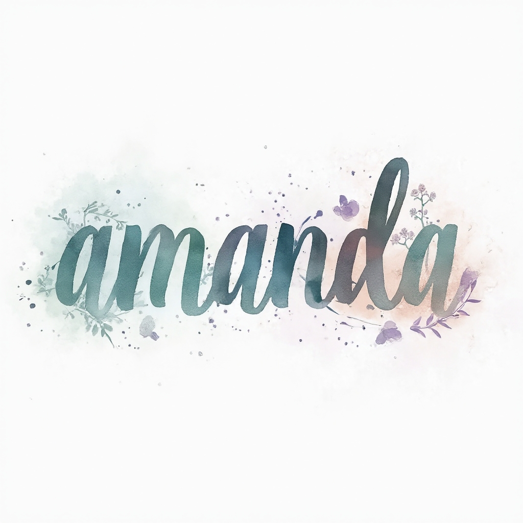Soft, flowing watercolor lettering where the name amanda melts through teal, lavender, and pink washes with delicate splashes.