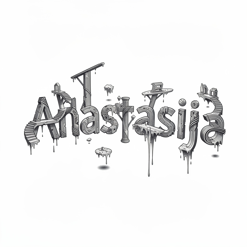 A dreamlike surrealist tattoo design in which the letters of Anastasija transform into floating, impossible structures.