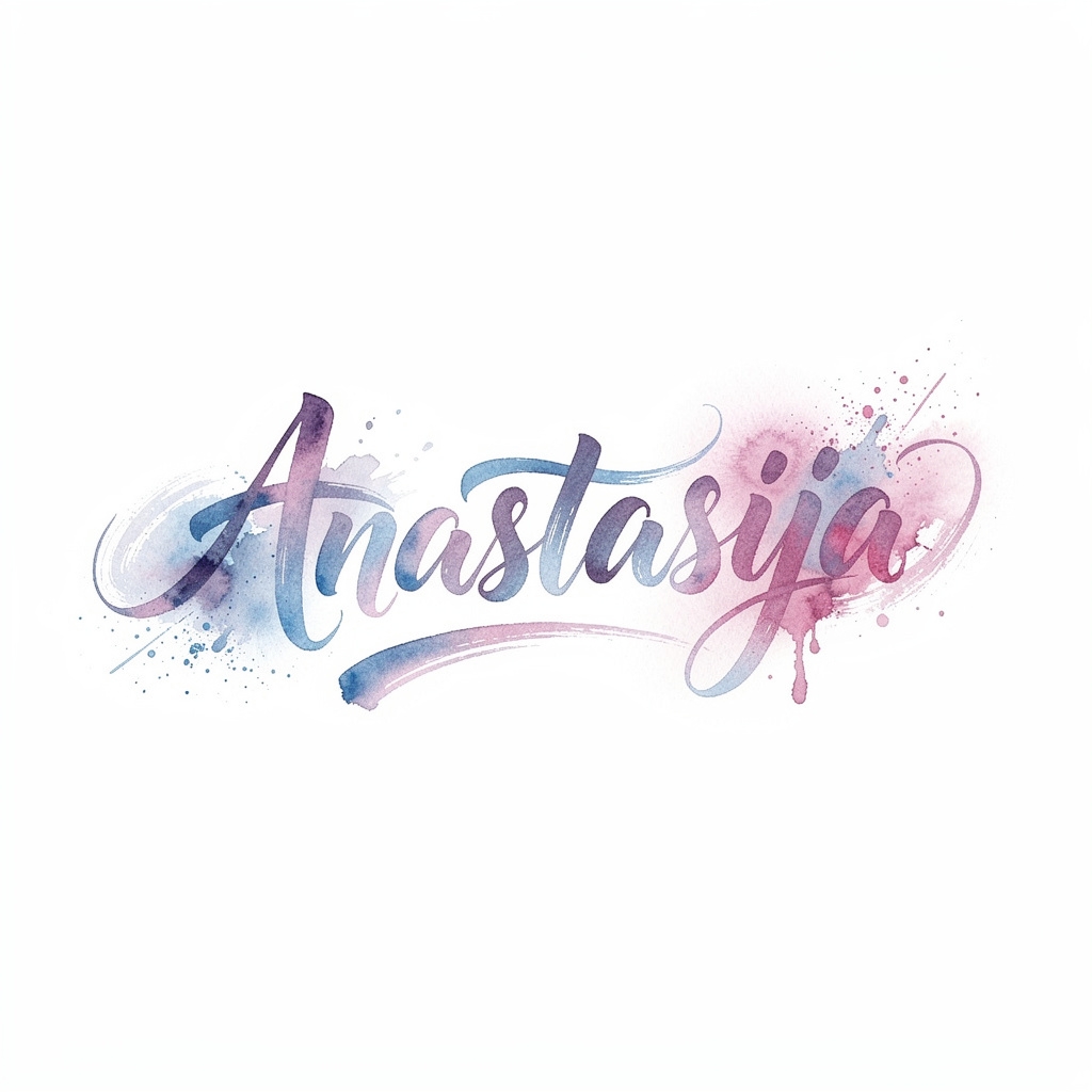 A soft, expressive watercolor tattoo composition where the name Anastasija is painted as flowing, brushstroke-style lettering.