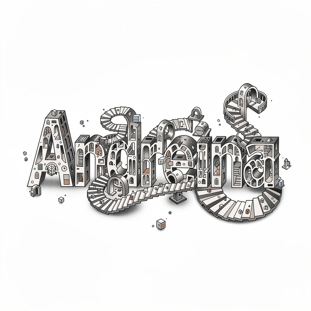 A surrealism-style tattoo design where the letters of Andreina transform into impossible architectural and abstract forms.