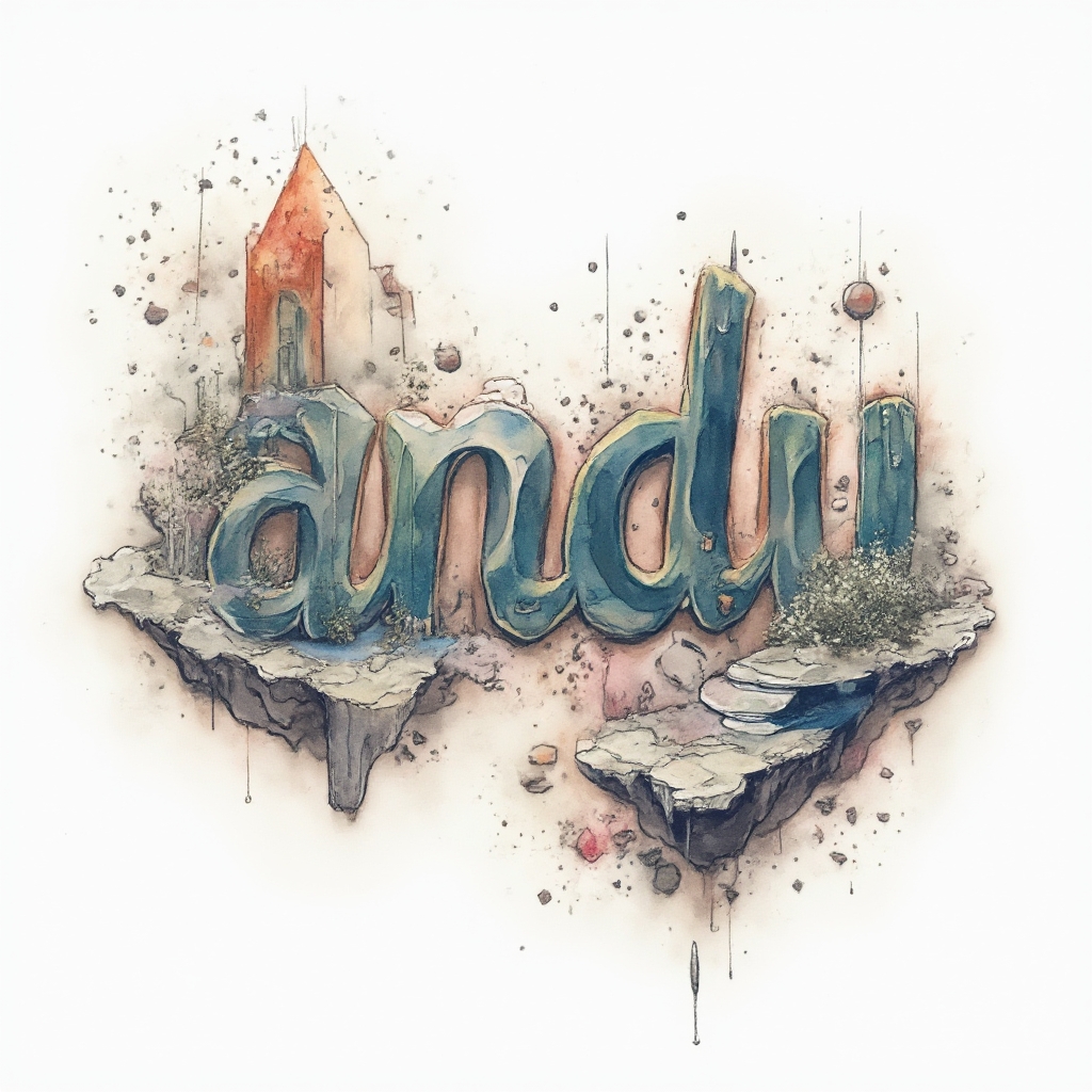 A surreal dreamscape tattoo design that turns the name andy into floating structures, rocks, and abstract forms on a white background.