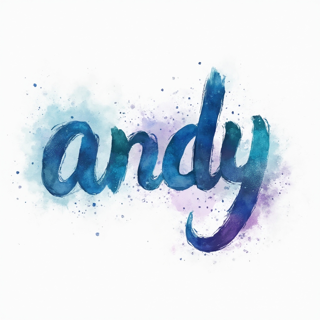 A vibrant watercolor tattoo concept where the name andy is built from fluid, painterly letters with splashes and gradients on a white background.