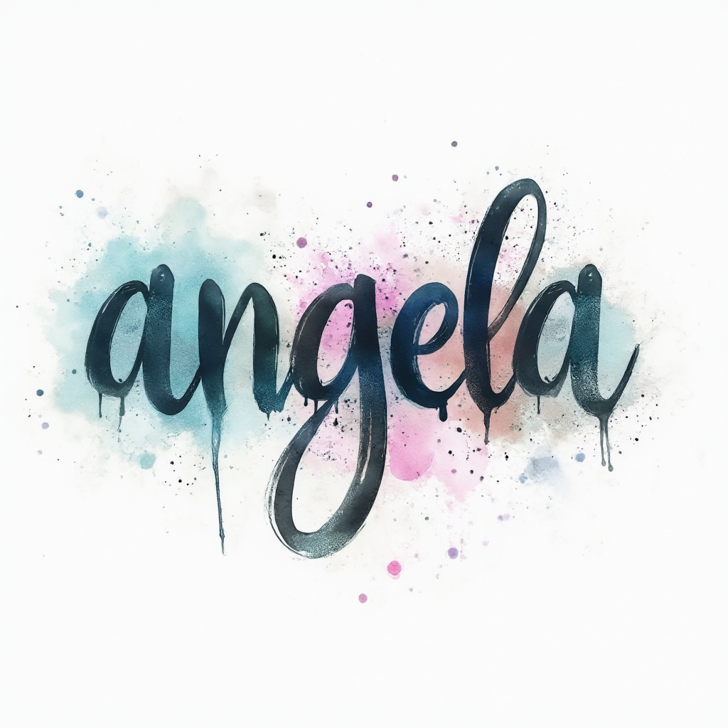 A vibrant Angela tattoo concept where the name becomes expressive watercolor brushstrokes, blending into colorful splashes on a clean white background.