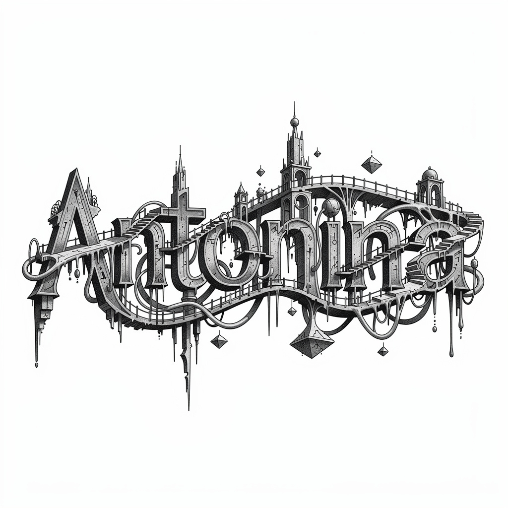 A dreamlike surrealist tattoo concept where the letters of Antonina twist into impossible shapes, forming a fantastical structure.