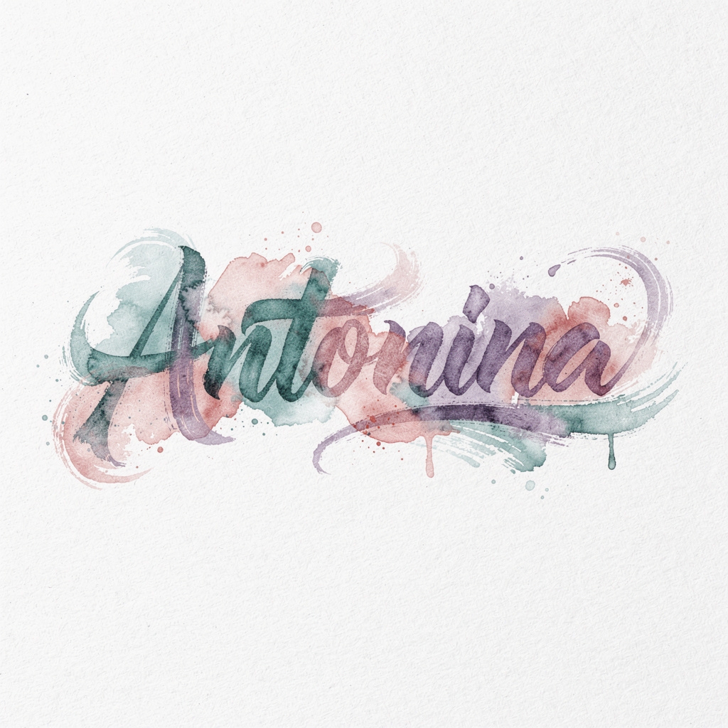 A delicate watercolor-inspired tattoo composition where the name Antonina is painted with soft, fluid color transitions and artistic splashes.