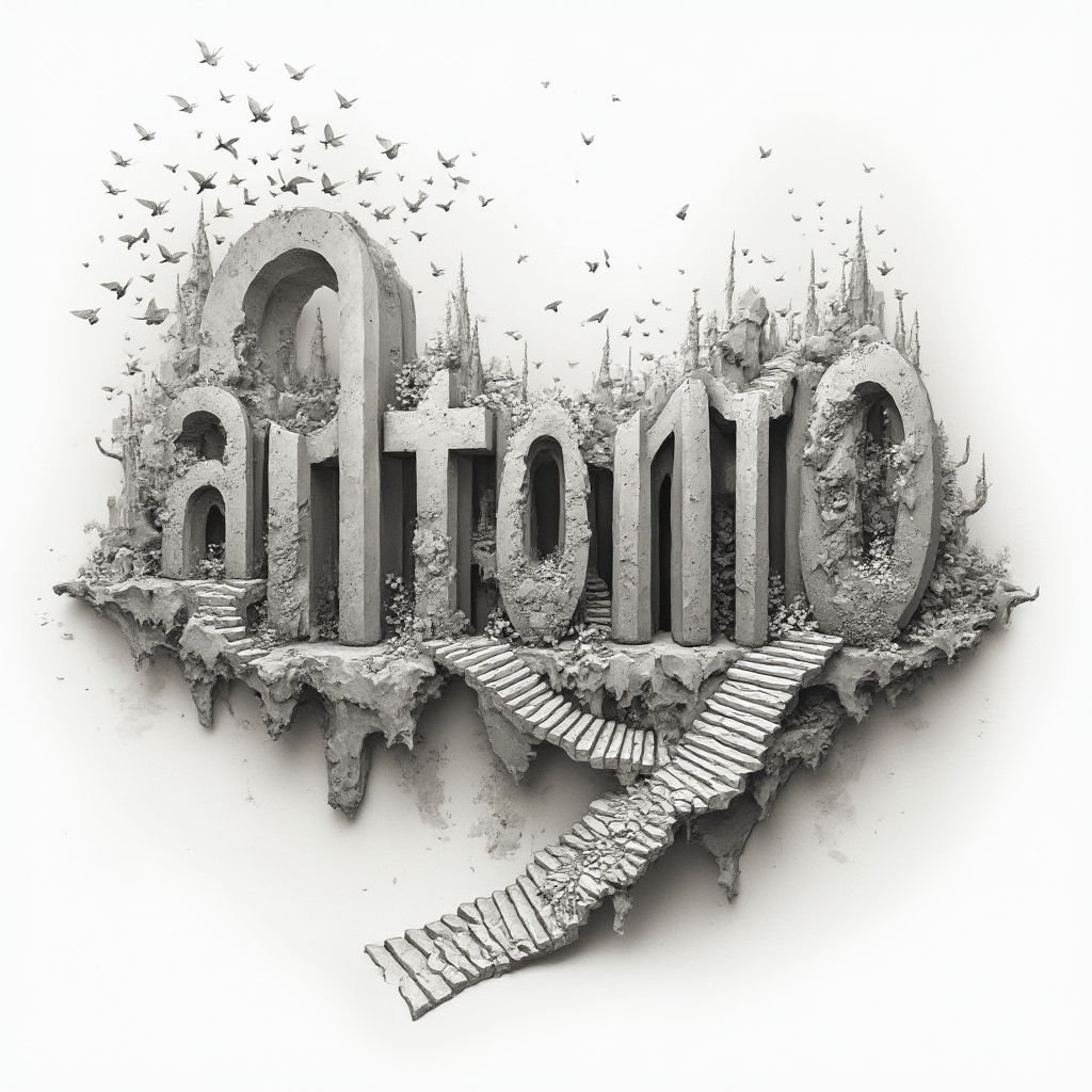 "antonio" transformed into a surreal, floating architectural form made of impossible staircases, arches, and dreamlike fragments.