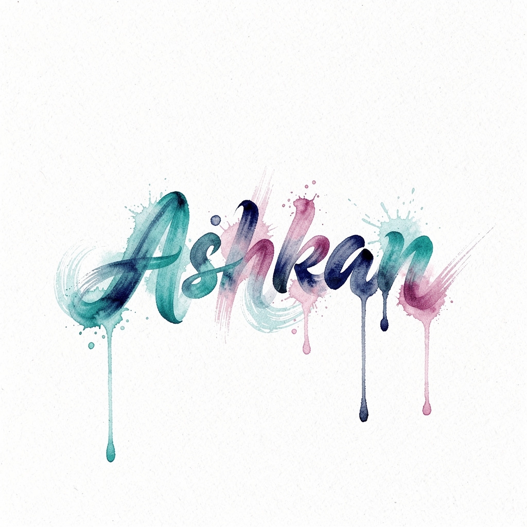 A soft yet vivid watercolor-style tattoo design where the name Ashkan emerges organically from layered washes of color.
