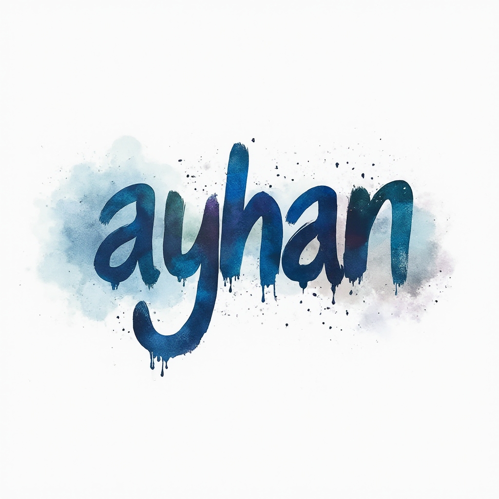A vivid watercolor tattoo concept where the name "ayhan" is painted with flowing, blended ink strokes and soft splashes on a white background.
