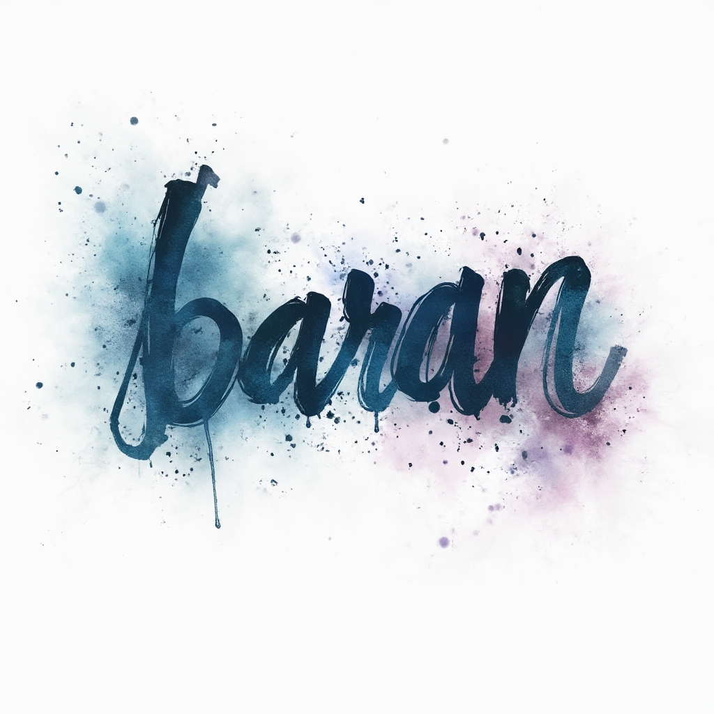 A flowing watercolor tattoo concept where baran appears as soft, brushstroke-style lettering with splashes and gradients on a clean white background.