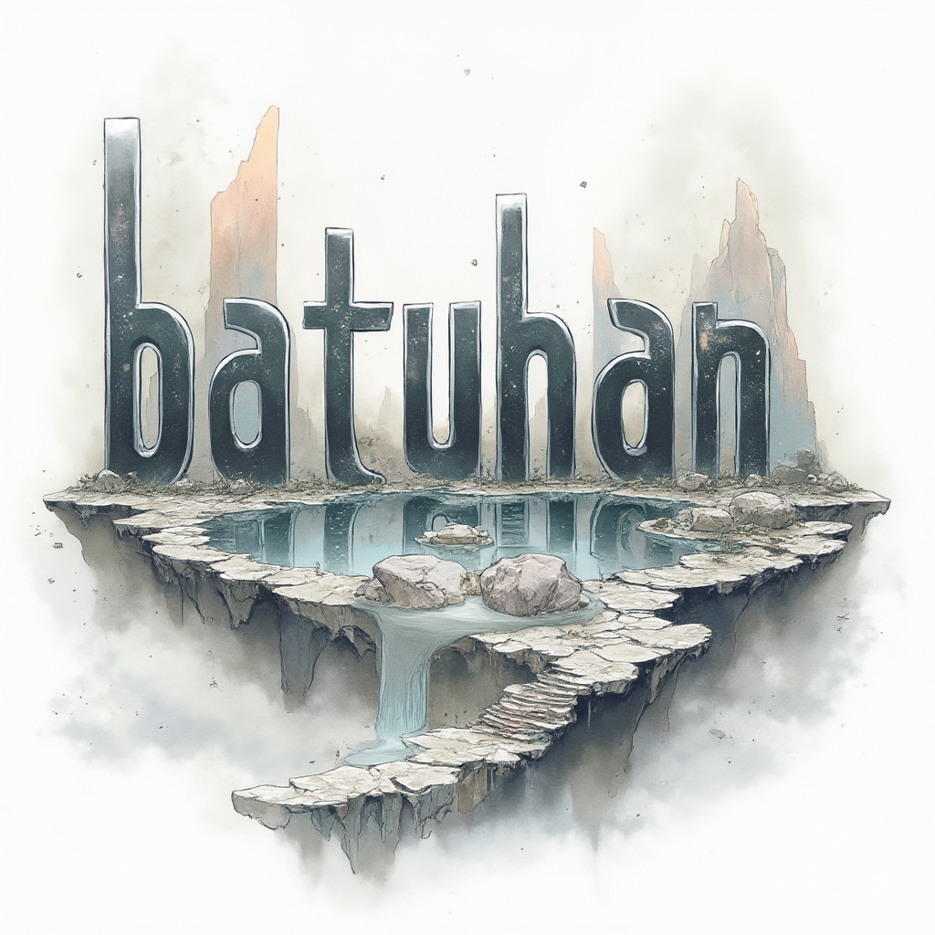 A surreal landscape where the letters of “batuhan” become reflective, melting structures in an impossible dream world.