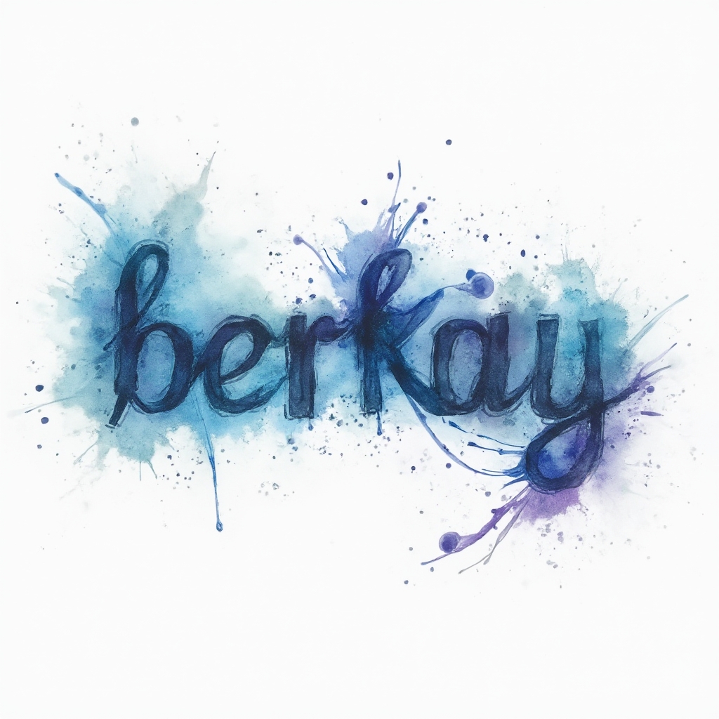 The name “berkay” flows as expressive watercolor calligraphy, built from swirling pigments, drips, and blooms on a white canvas.