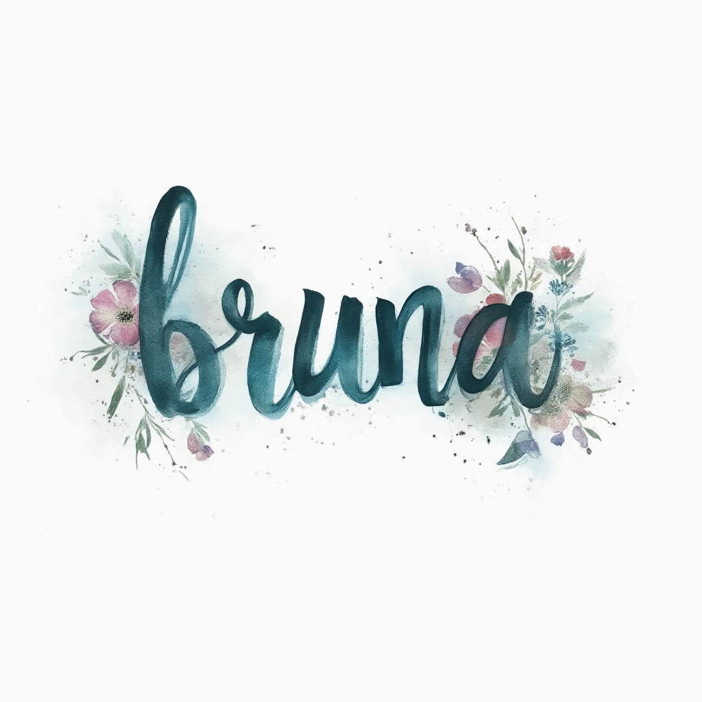 A soft, flowing watercolor interpretation of “bruna,” built from translucent brushlike lettering and splashes on a white background.