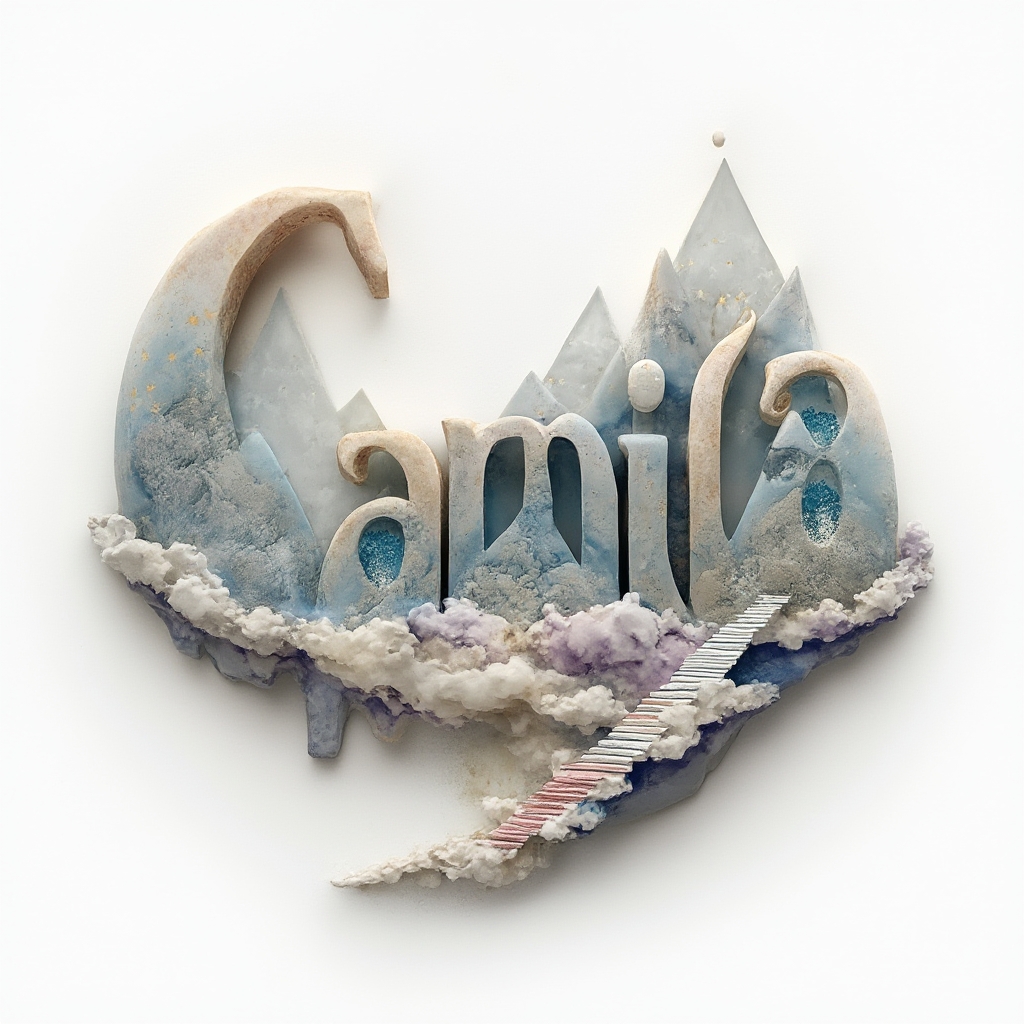 A surreal dreamscape where each letter of “camila” becomes a fantastical structure, blending architecture and cosmic elements into one imaginative design.