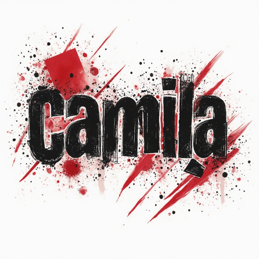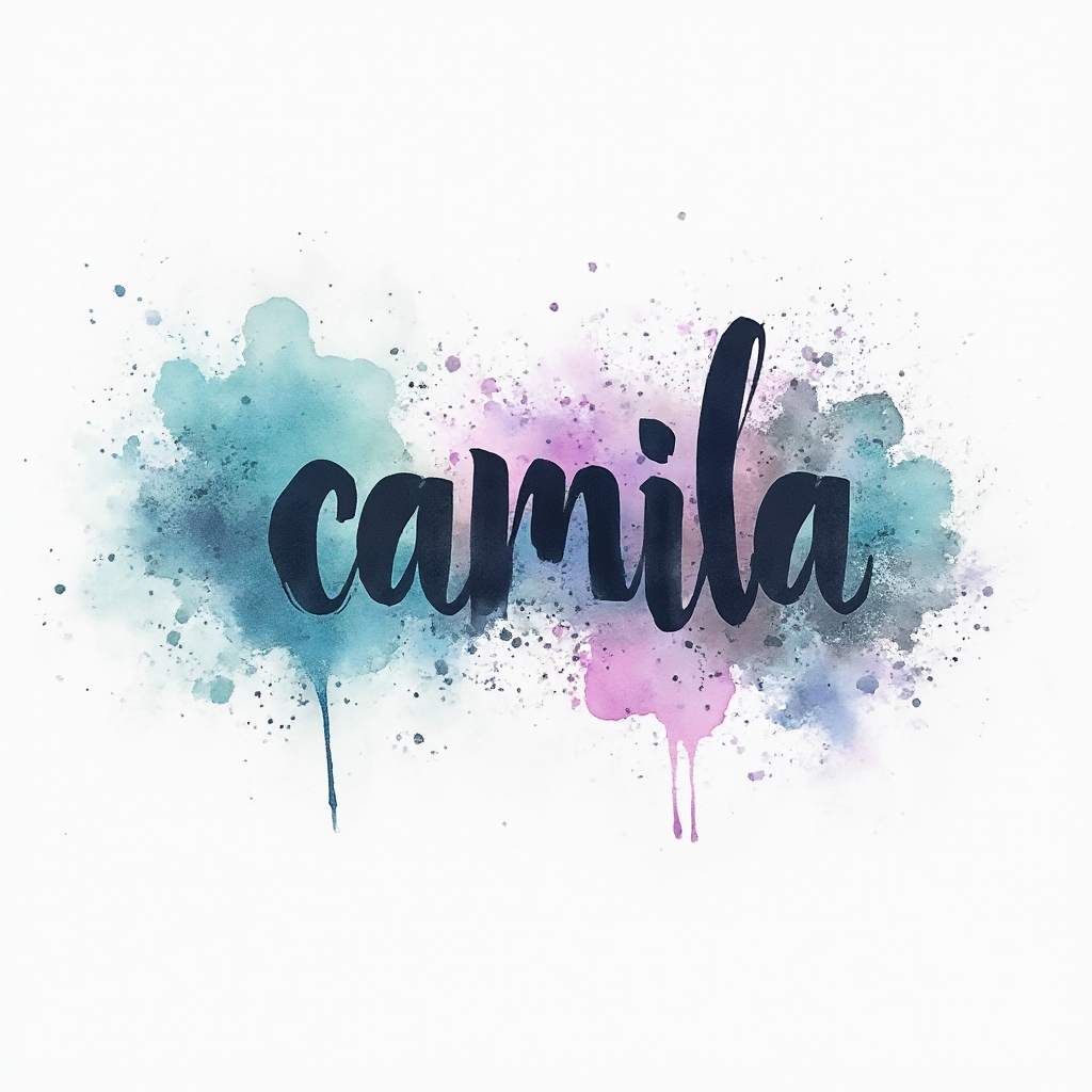 A flowing watercolor interpretation of “camila,” with painterly script, soft pigment blooms, and colorful splashes for a light, expressive feel.