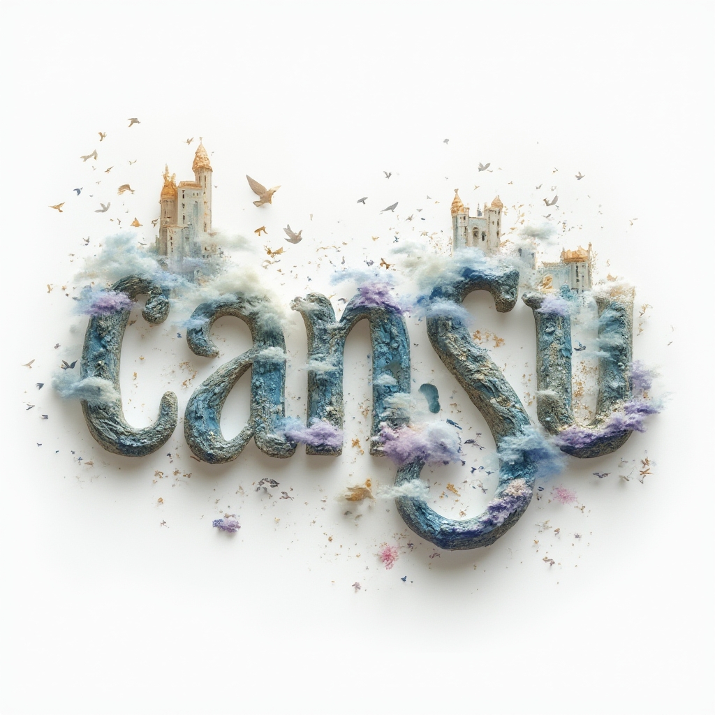 A surreal dreamscape where the letters of "cansu" morph into floating islands, clouds, and impossible structures against a pure white background.