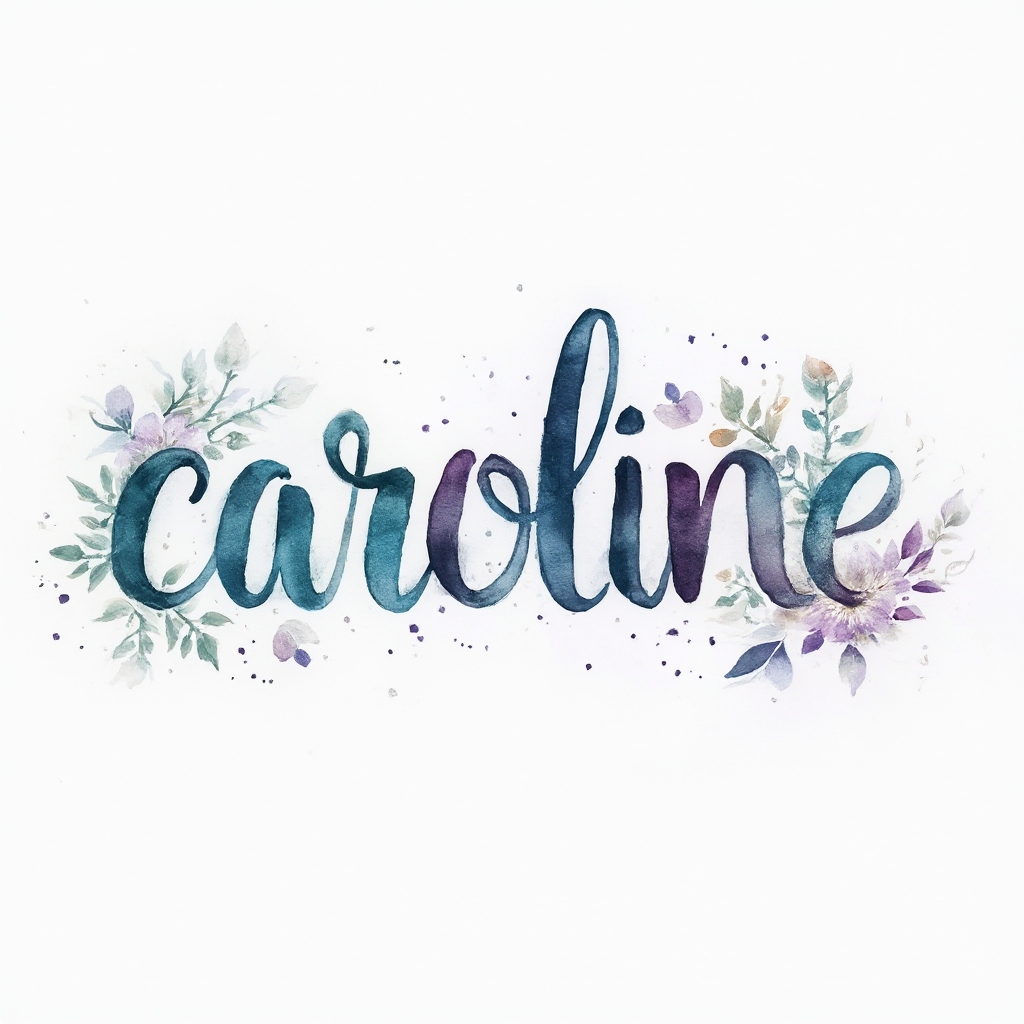 A soft, painterly watercolor design where the name "caroline" appears as fluid, colorful brushstroke lettering with splashes and gradients.