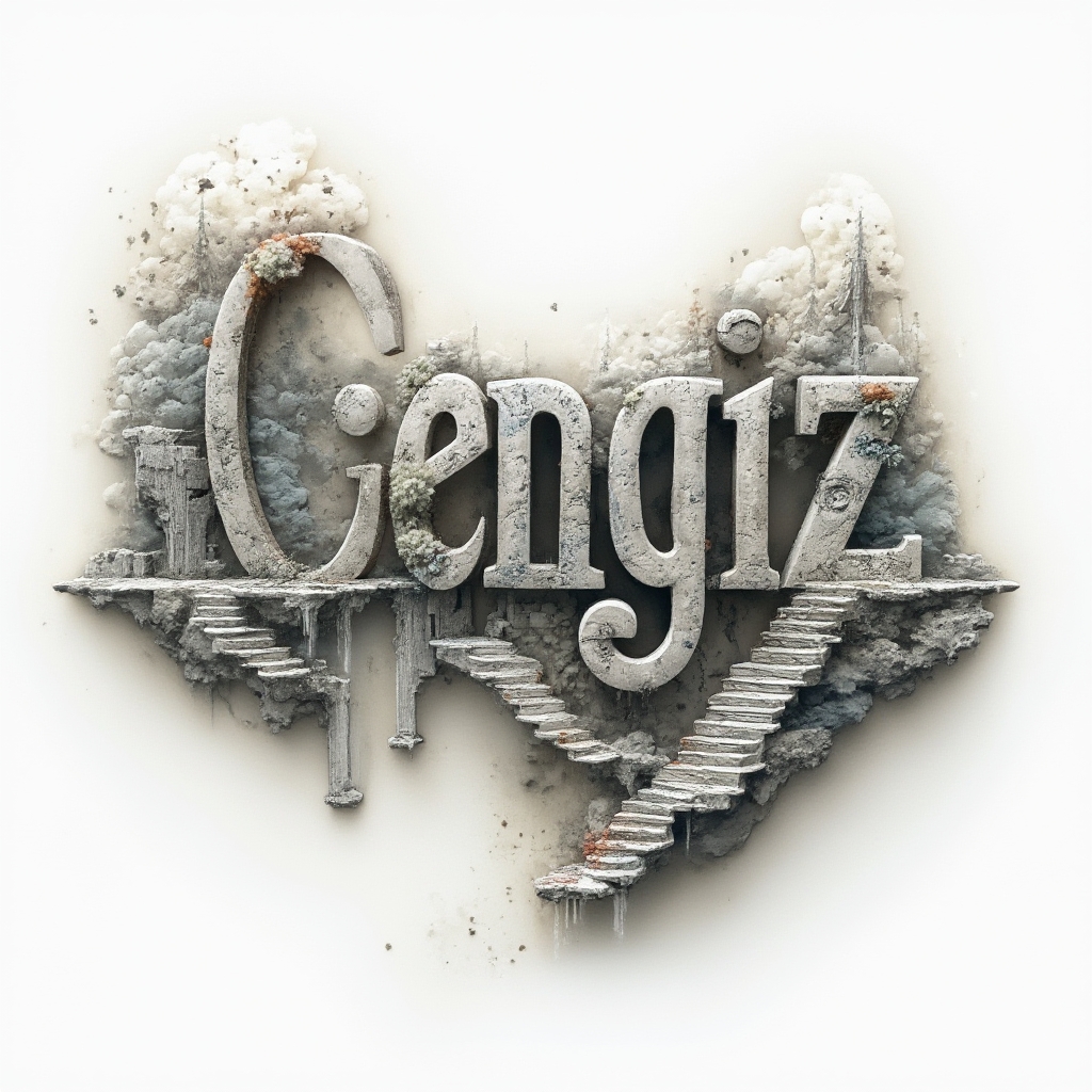 A surreal architectural vision of the name cengiz, formed from floating, impossible structures and dreamlike stone letters.
