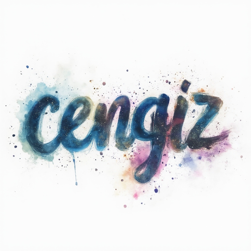 A dreamy watercolor galaxy interpretation of the name cengiz, painted as flowing multicolor brushstroke letters with cosmic textures.