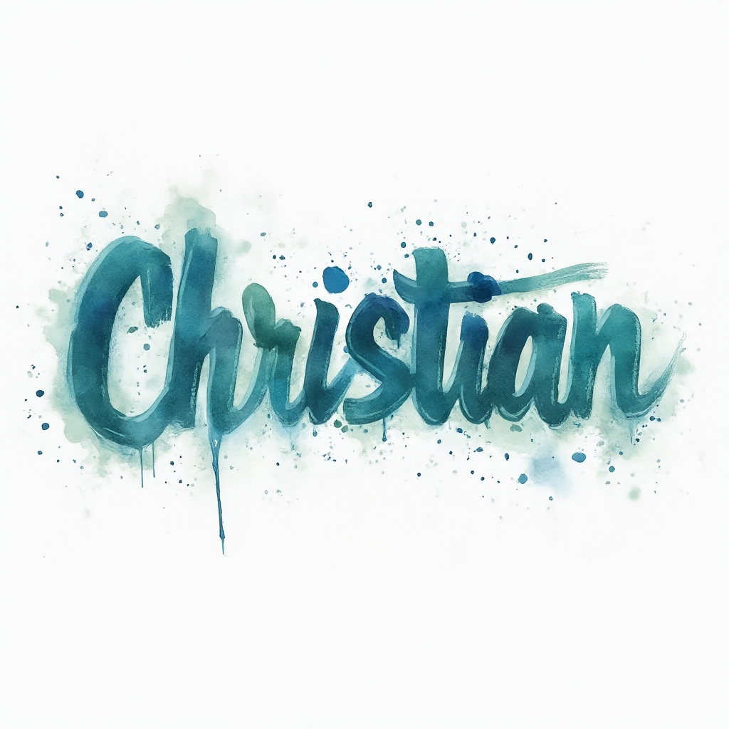 A fluid watercolor composition where the name ‘christian’ appears as softly blended brush strokes and splashes on white.