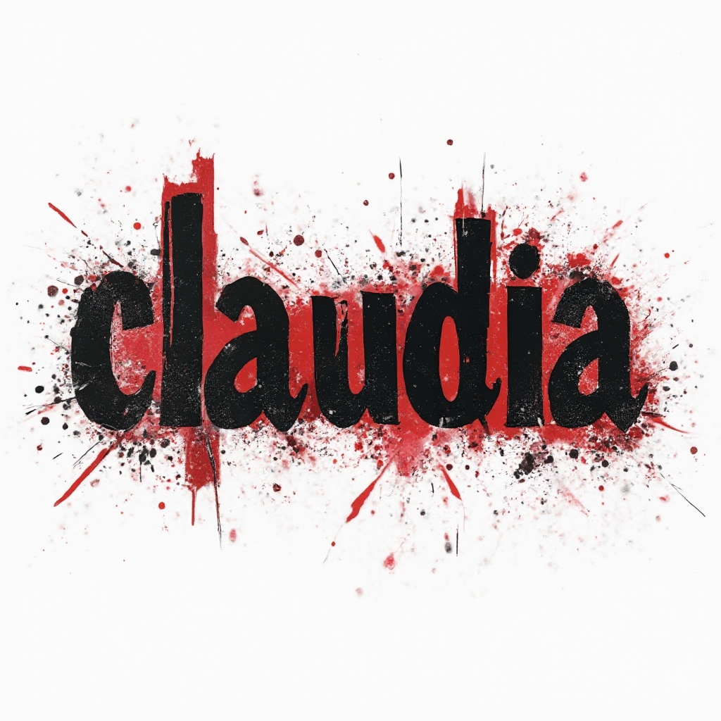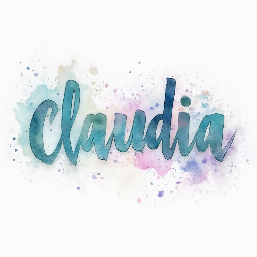The name “claudia” rendered as flowing watercolor calligraphy with soft gradients, splashes, and abstract blooms on a white background.