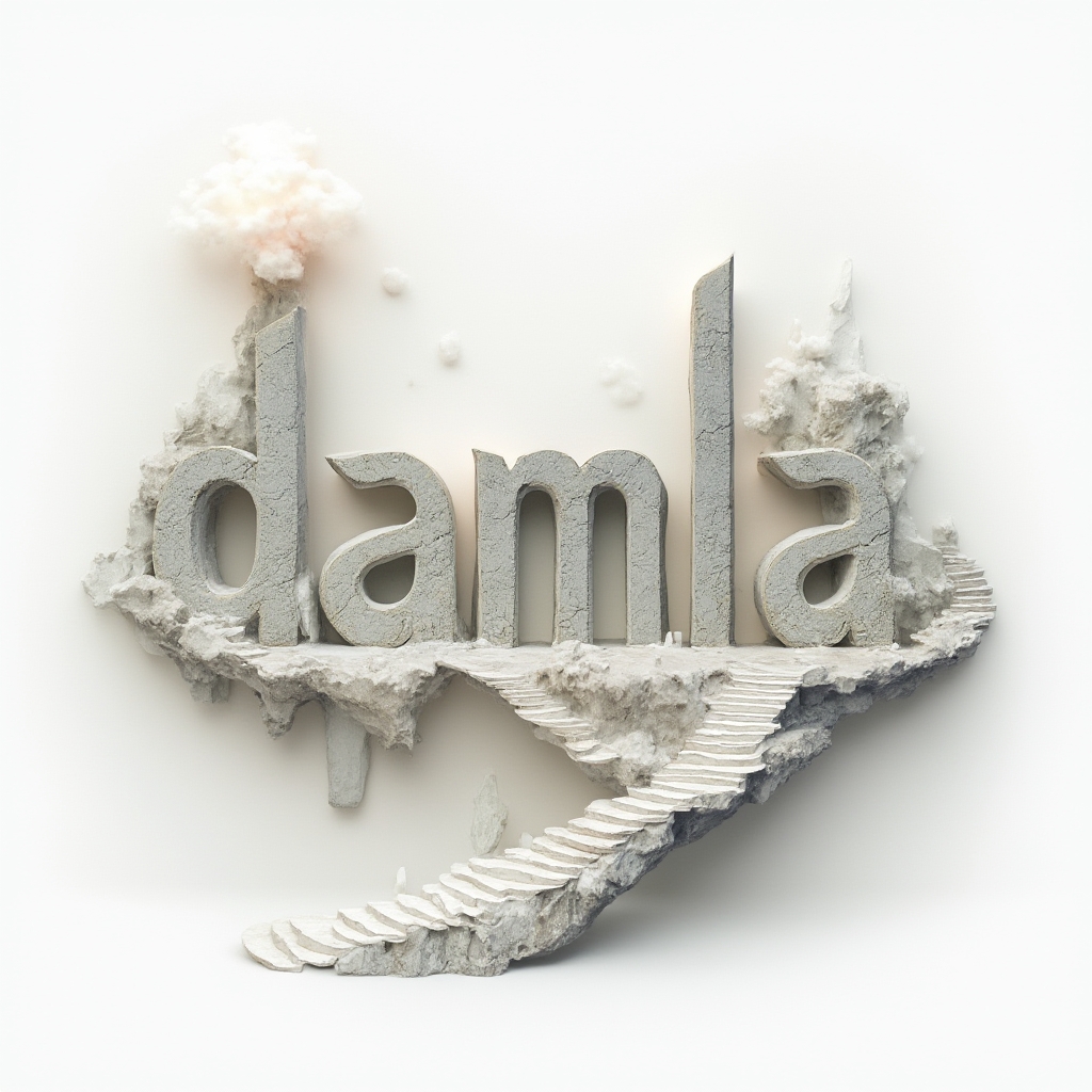 A surrealist dreamscape where the letters of "damla" transform into floating islands and impossible structures.