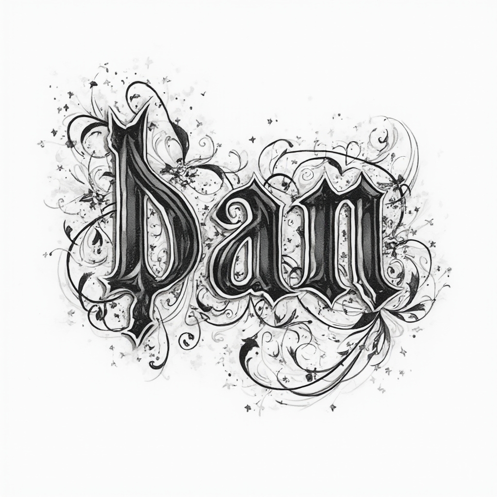 A surreal dreamscape tattoo concept with the name "dan" transformed into impossible architectural structures floating in a minimal space.