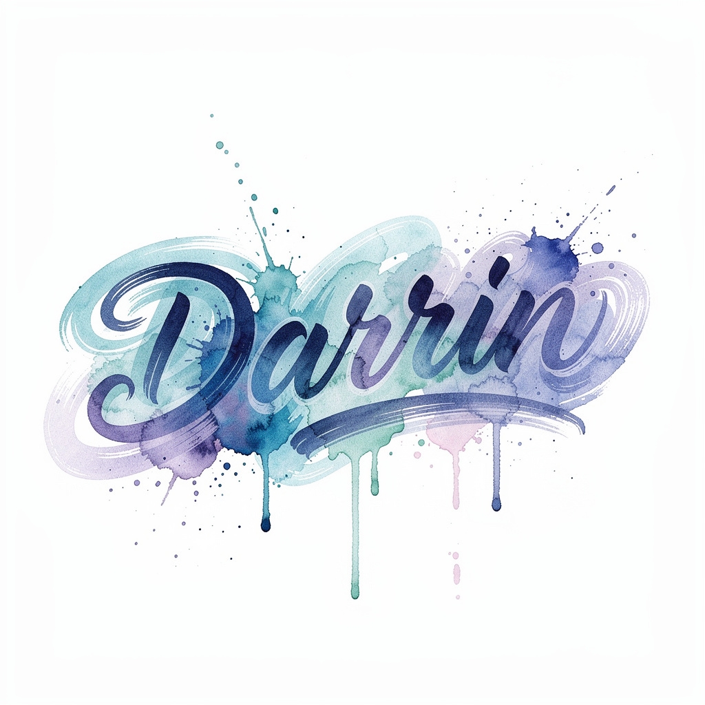 A soft, expressive watercolor tattoo concept where the name Darrin appears as brush-painted lettering, merging with colorful splashes.