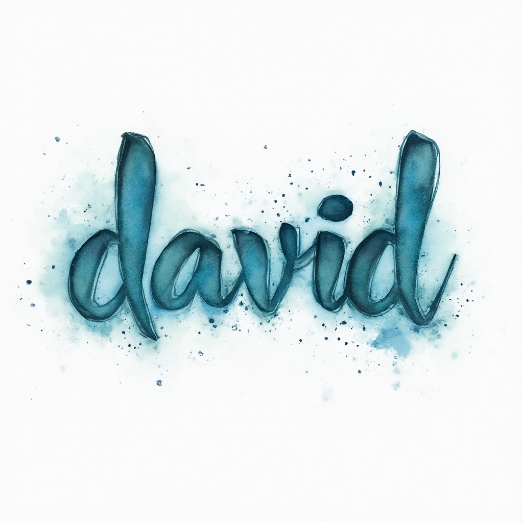 The name "david" formed by fluid watercolor calligraphy with soft gradients, splashes, and blooms, floating on a clean white background.