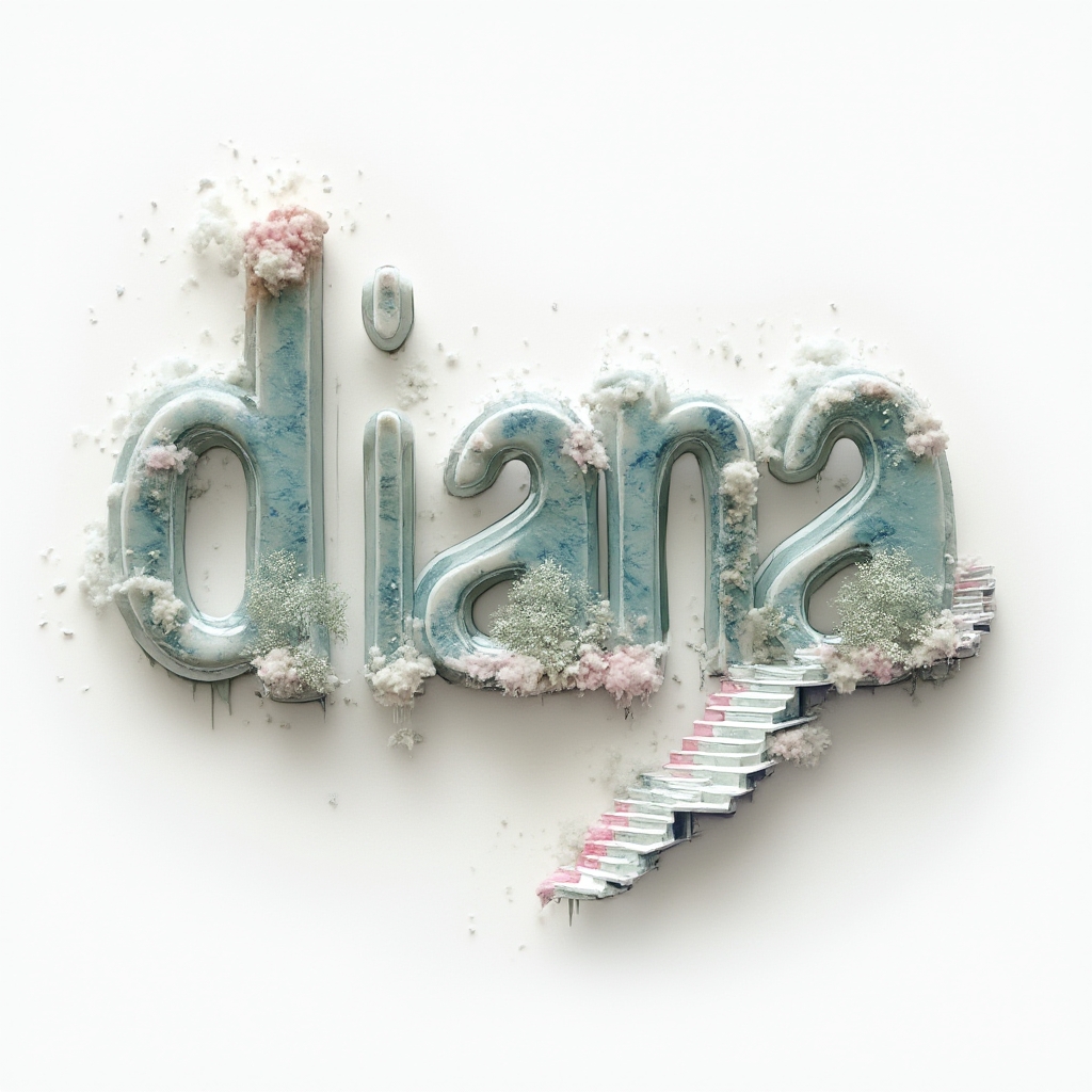 A dreamlike surreal design where the name "diana" becomes an impossible landscape of stairs, clouds, and liquid metal.