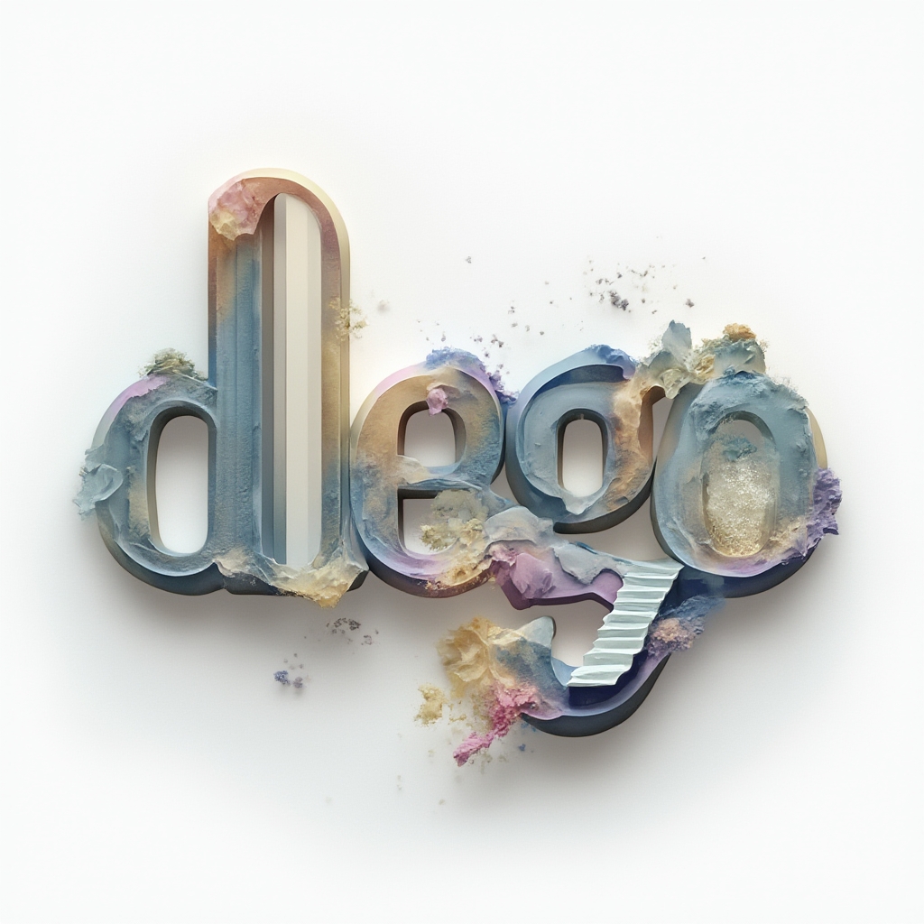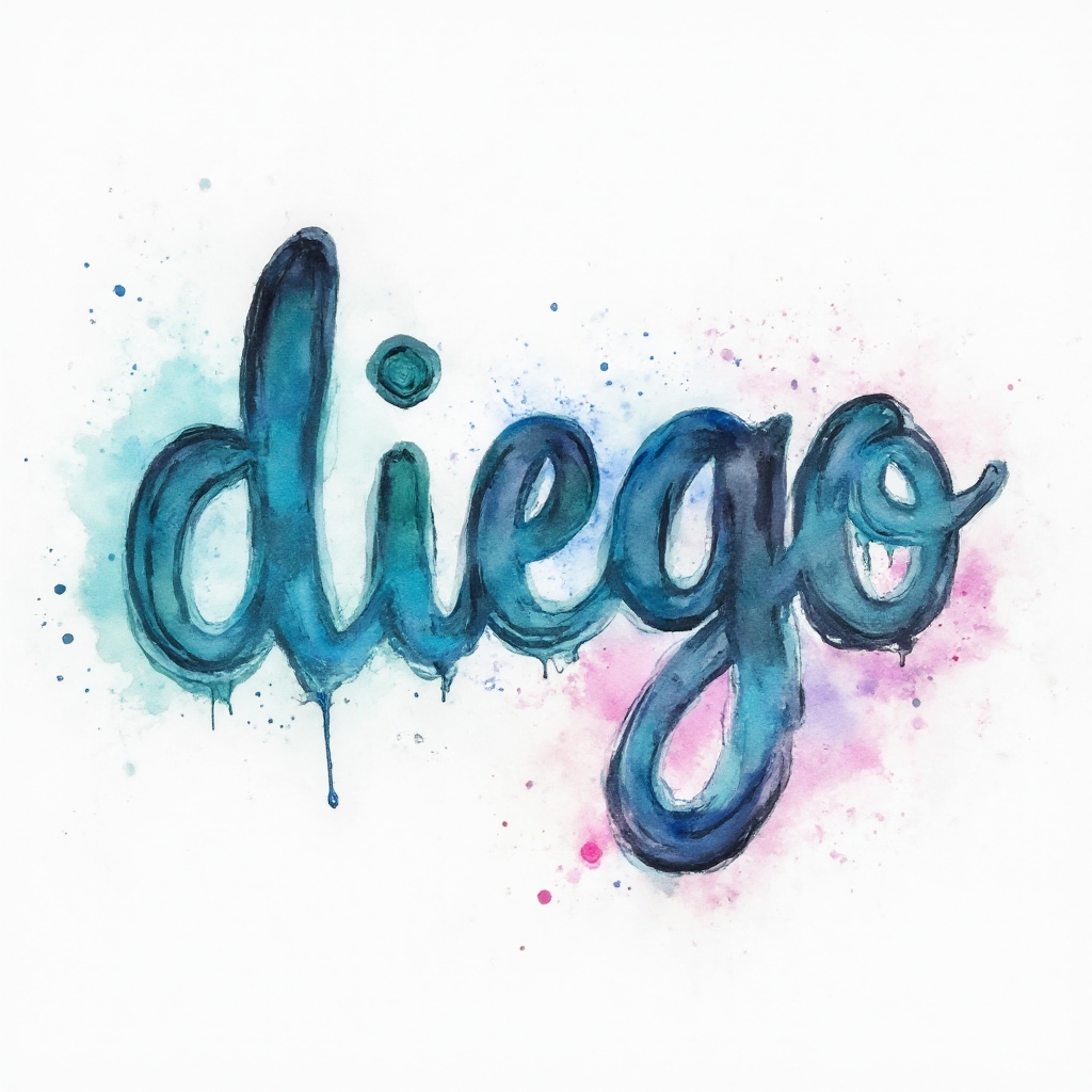 A flowing watercolor tattoo concept where the name "diego" dissolves into splashes, gradients, and paint blooms on a pure white background.
