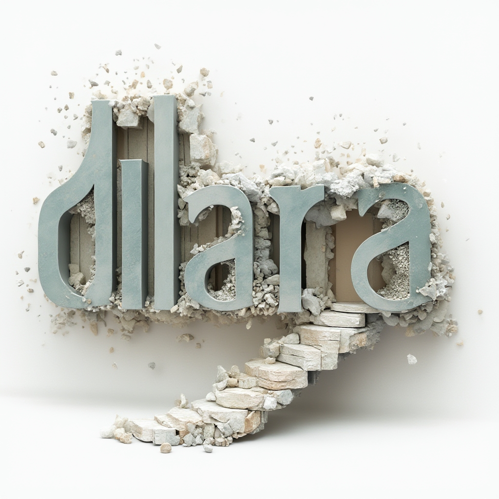 A surreal, dreamlike version of 'dilara' where the letters become floating structures, fragments, and impossible architecture.