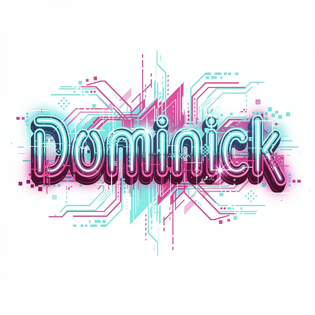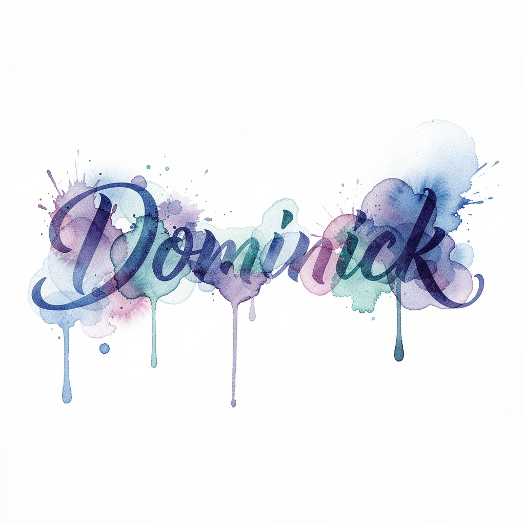 A dreamy watercolor interpretation of the name Dominick, where the letters blend seamlessly into colorful, fluid paint textures.