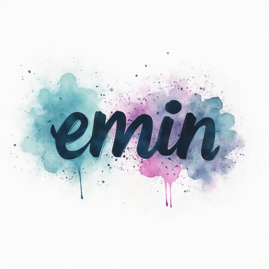 The name 'emin' appears as flowing watercolor brushstroke lettering, dissolving into vibrant splashes and soft color washes.