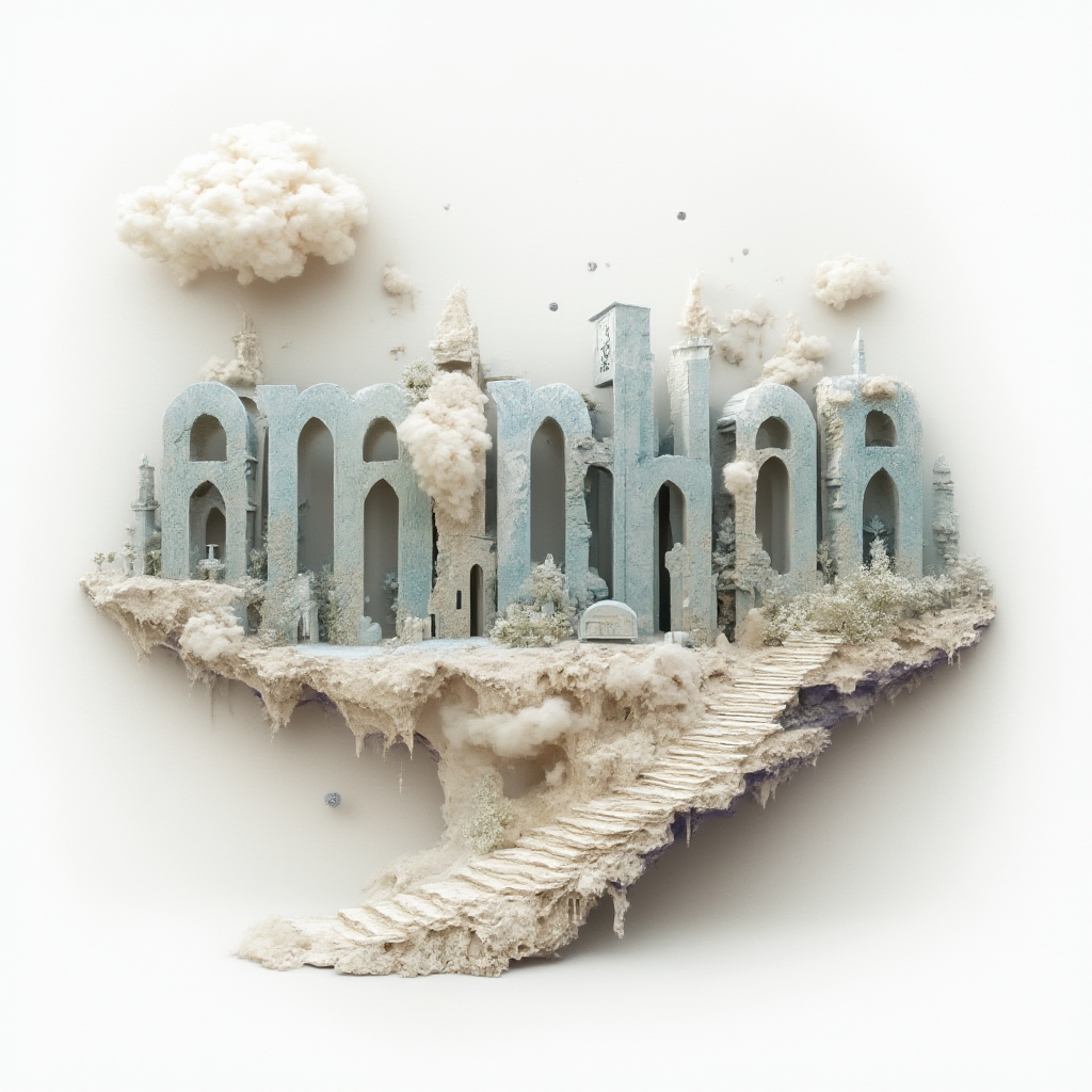 A surrealist tattoo concept where the name emirhan transforms into an impossible dreamscape of arches, stairs, and celestial elements.
