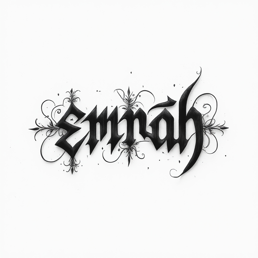 Intricately stylized tattoo design of the name emrah made of angular, ornamental black lines on a white background.