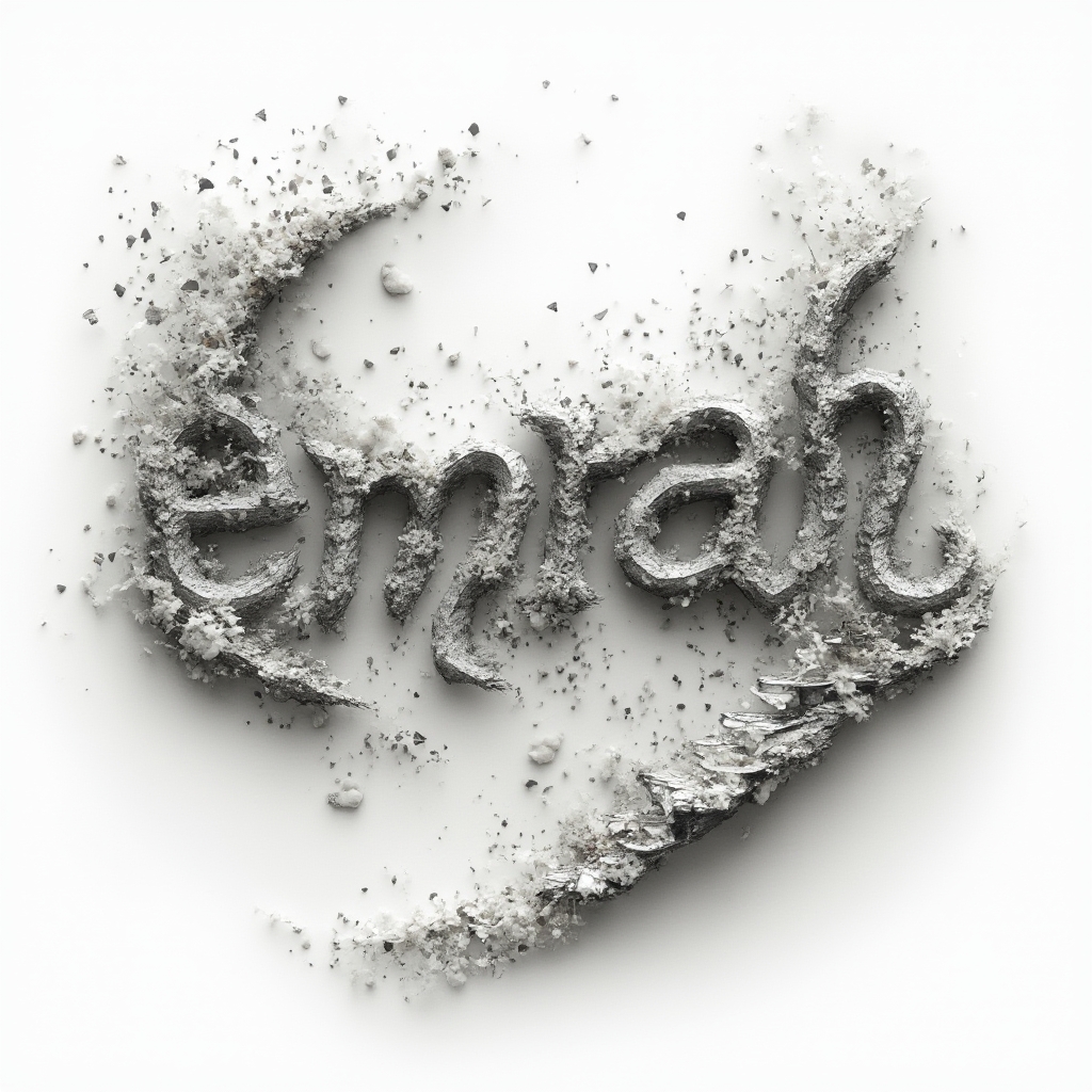 The name "emrah" rendered as a surreal, impossible structure of floating fragments, ribbons, and dreamlike forms.
