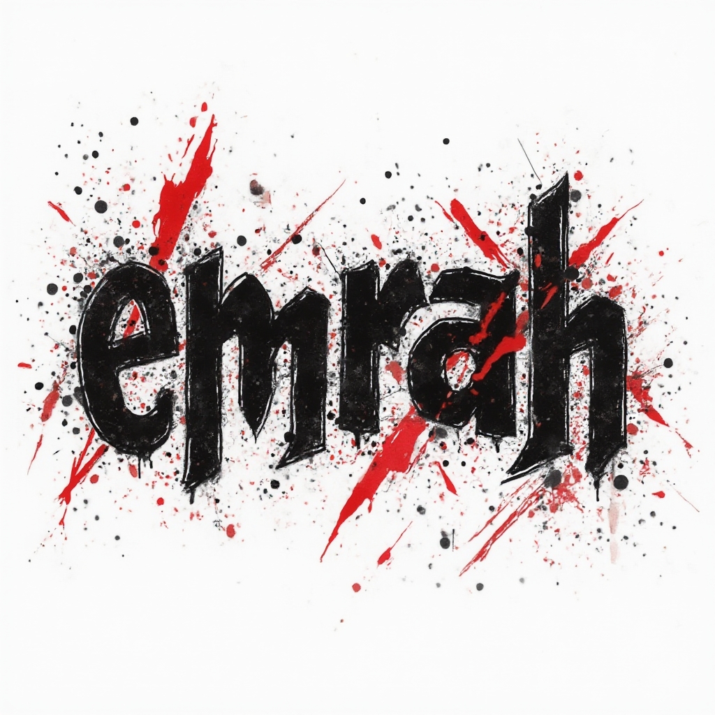 The name "emrah" in bold, distressed Trash Polka style, surrounded by chaotic red and black splashes and geometric textures.
