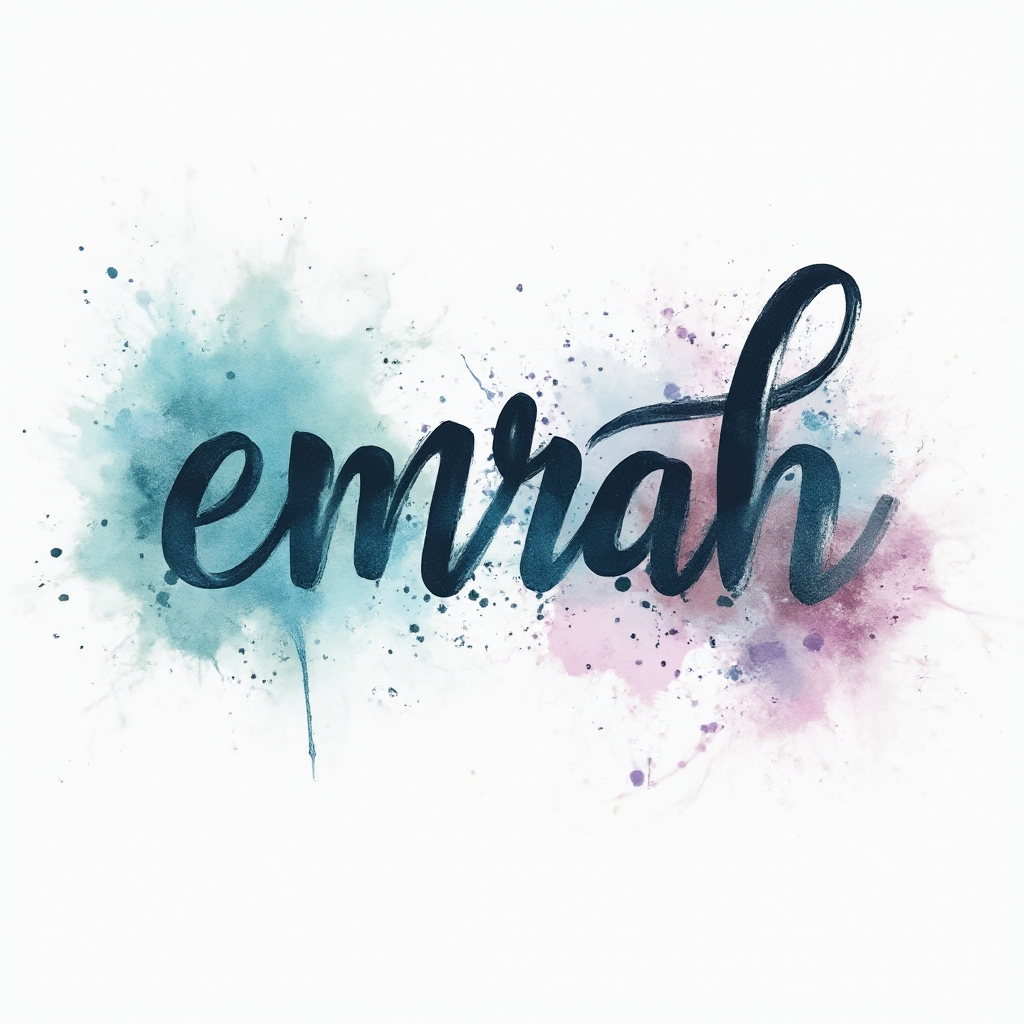 The name "emrah" formed by flowing watercolor brushstroke lettering, surrounded by splashes and gradients for a soft, artistic look.