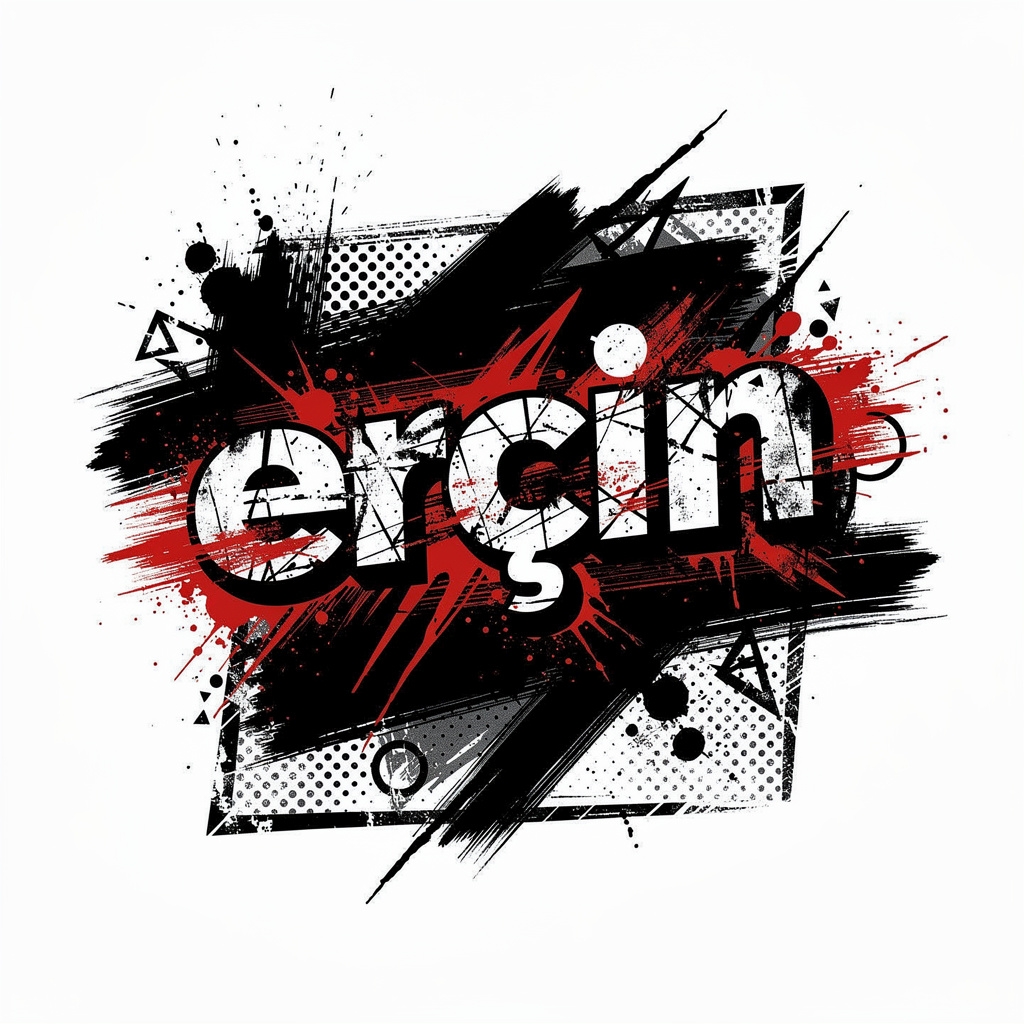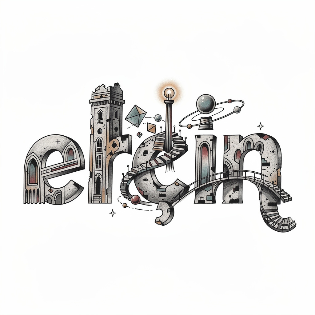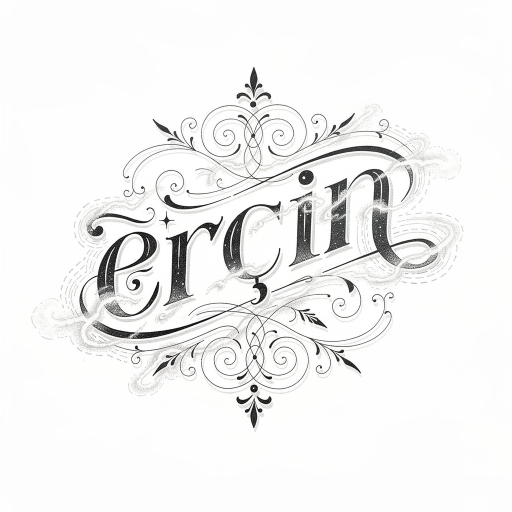 A surrealist black-and-grey tattoo design where the letters of Erçin transform into dreamlike abstract structures.