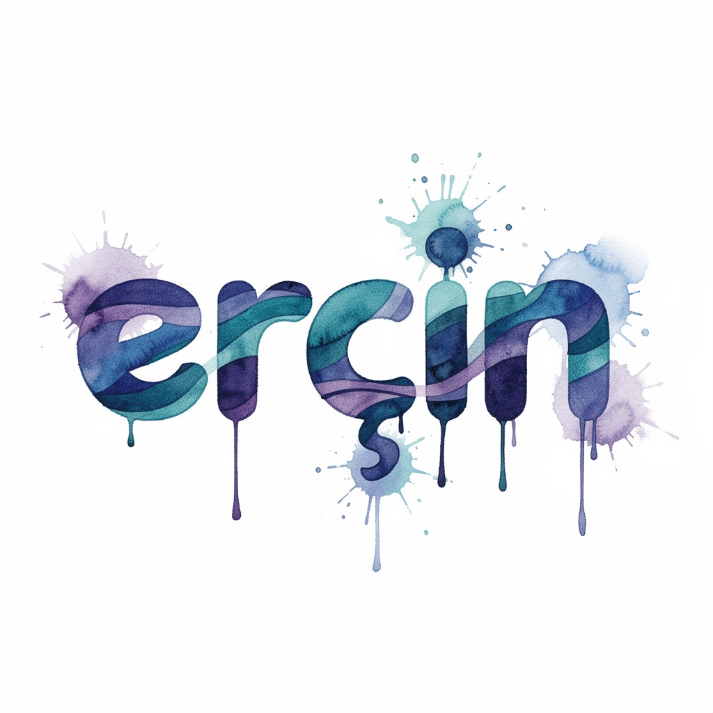 A vibrant watercolor tattoo composition where the name Erçin flows as colorful painted lettering, designed as professional tattoo flash.