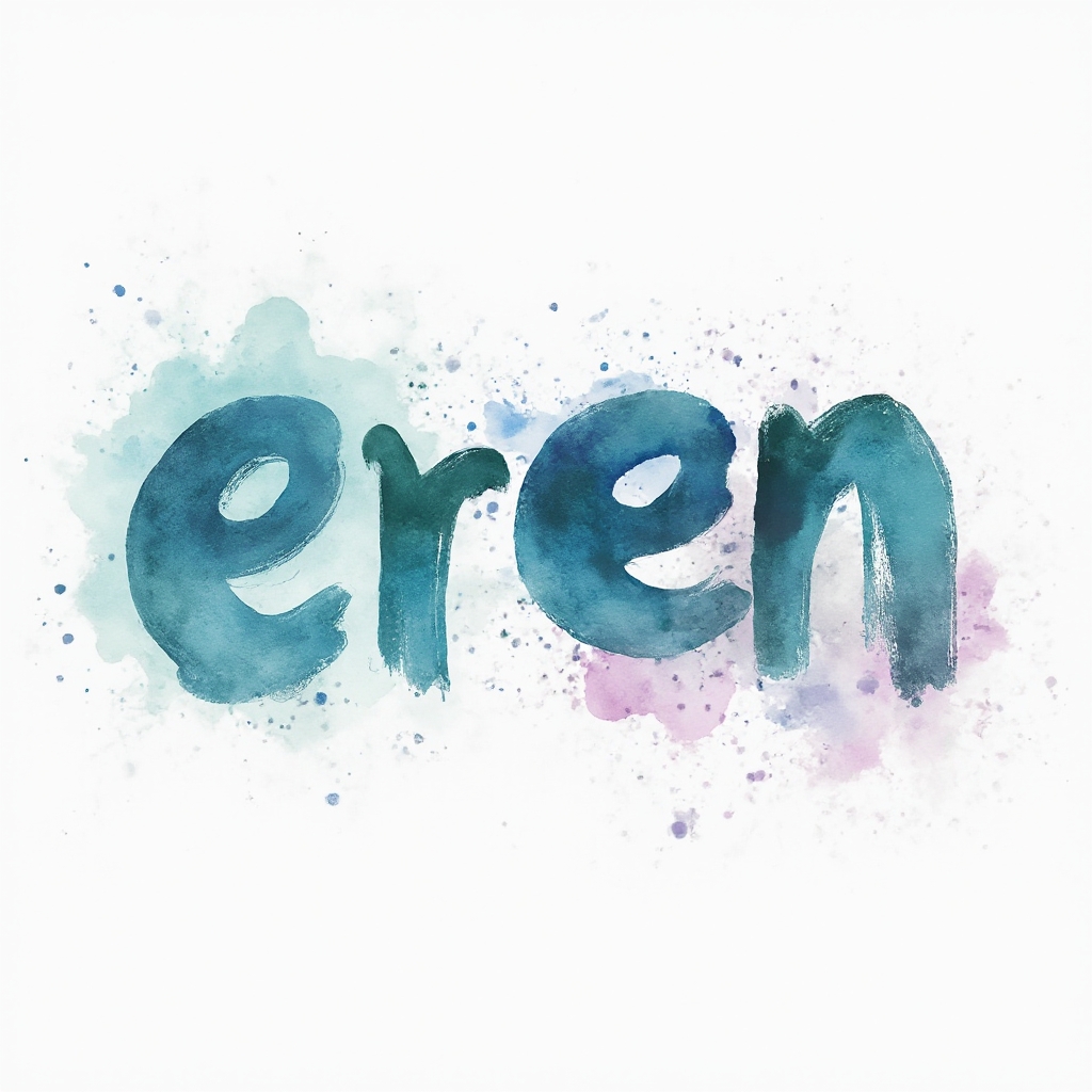 A vibrant watercolor interpretation of the name “eren,” painted as flowing brushstroke letters with soft blends, blooms, and splashes on a white background.