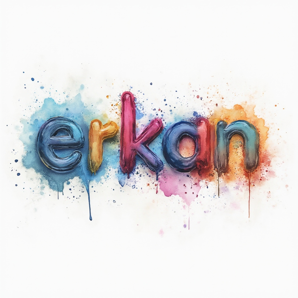 A flowing watercolor-inspired design where the name “erkan” dissolves into splashes, gradients, and soft pigment clouds.