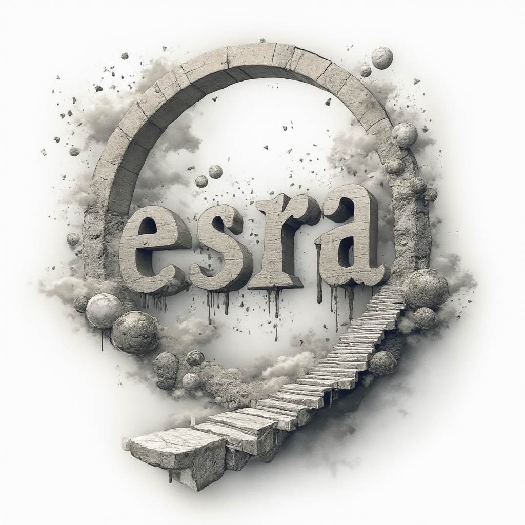 A surrealist vision of “esra” transformed into floating, impossible architecture and dreamlike objects suspended in white space.