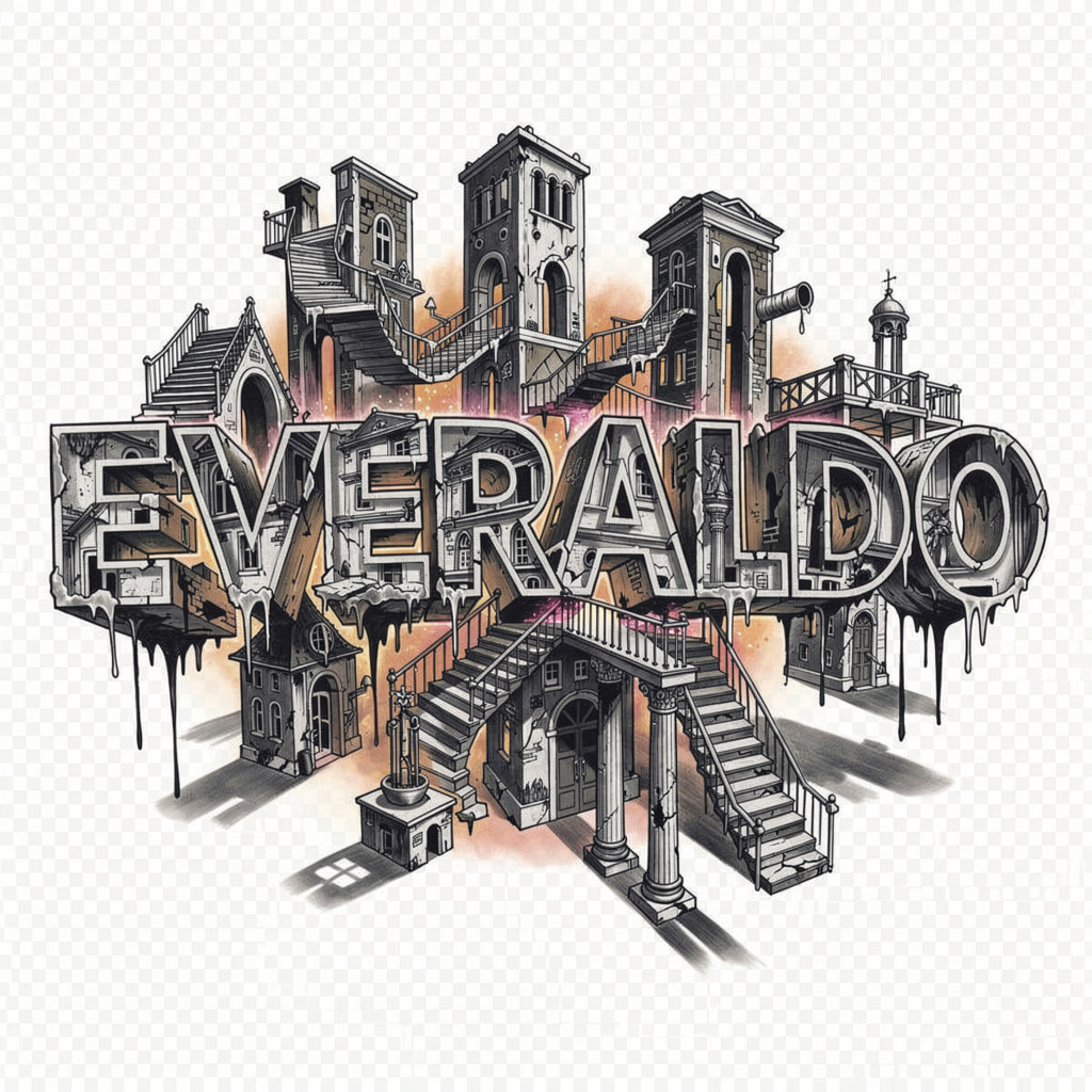 A surrealist tattoo concept that turns the letters of Everaldo into impossible structures and shadowy, dreamlike forms.