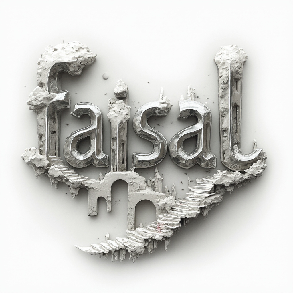 A surrealist tattoo concept transforming the name “faisal” into impossible chrome-like sculptural letters set within a floating dreamscape on white.